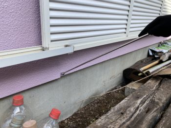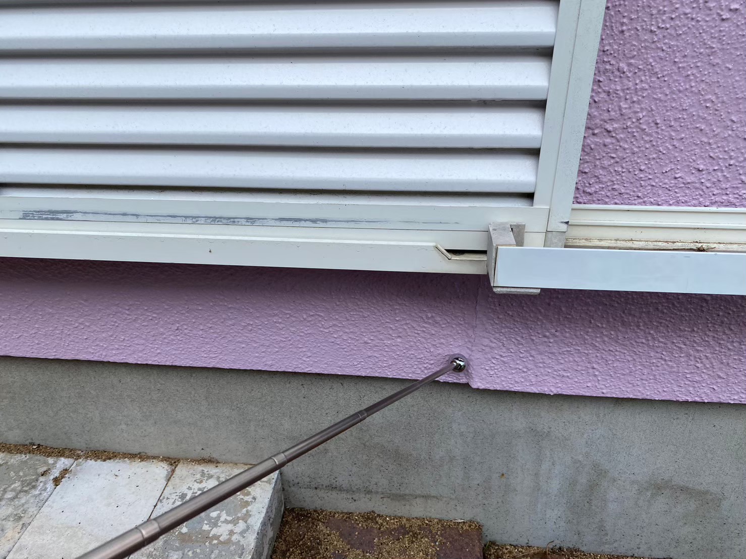 今回の点検で特に気になったのは南面の雨戸の下のこのような塗膜のひび割れでした。今回は塗装というよりは建築時の施工方法と深く関係した症状。全体的にモルタルで仕上げられた外壁のうちこの雨戸の部分だけが、別の下地材が使われているために段差ができてしまっています。このような場所には例えば地震などの小さな揺れでも断続的に負荷が加わり続けると、その上にのった塗膜は割れやすくなってしまうのです。