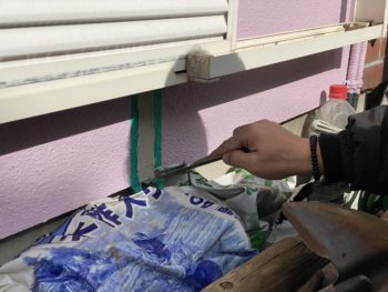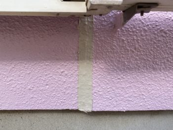 建物本体をむしばむ大きなダメージではないし、すぐに実害があるかといえばそういうことはありません。しかし、塗装職人でもあるこうちゃんなら簡単にできる修繕のやり方があります。それは「コーキング+塗装」。まずは、ひびになった部分をはさむように2本のマスキングテープを張り付けて補修範囲を決めます。そうしたらその上からひび割れ部分に塗り込むようにしてコーキング剤を充填。