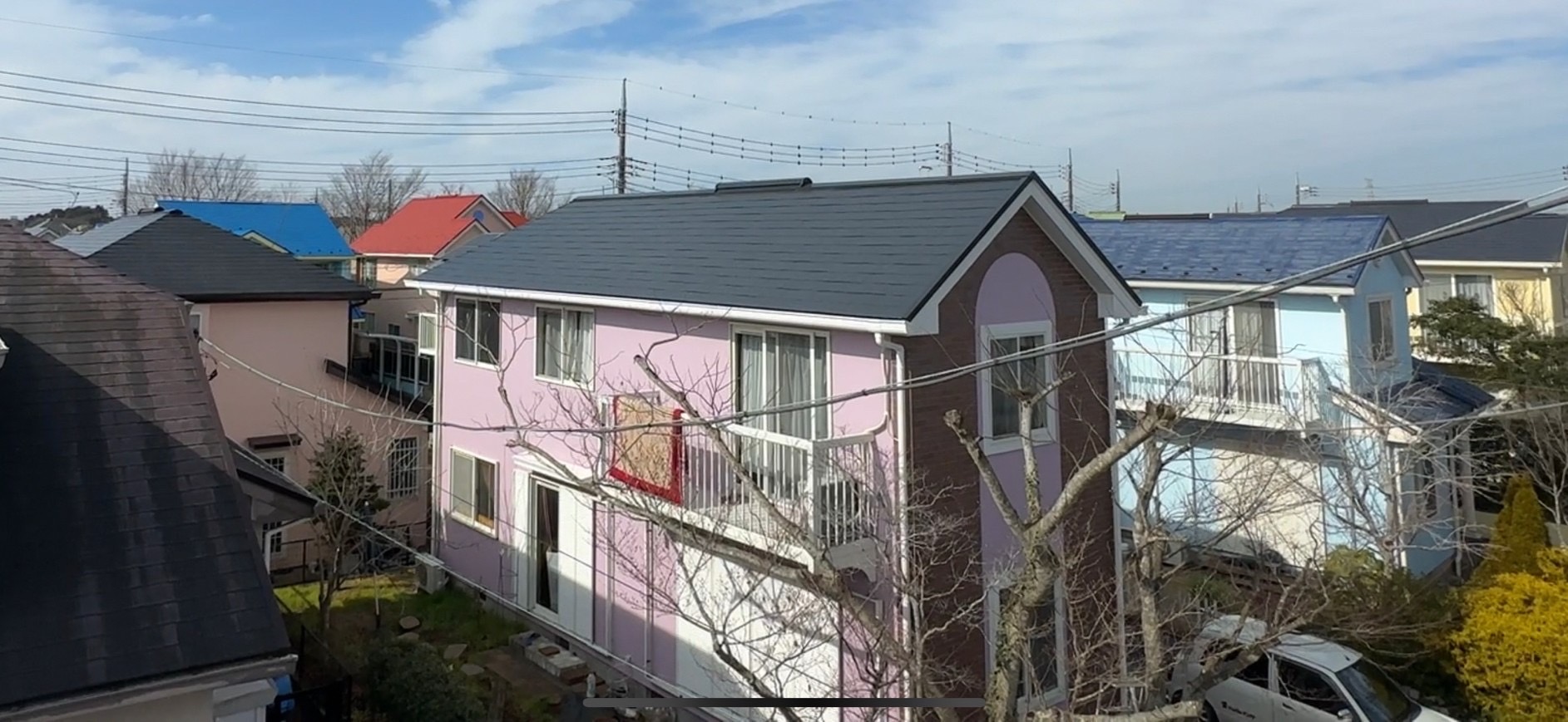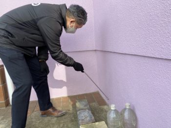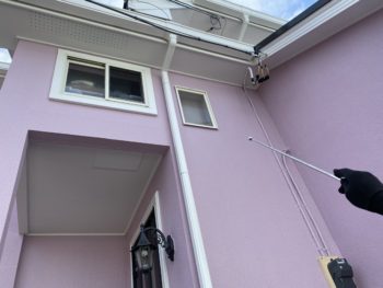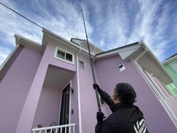 この日こうちゃんがやってきたのは、弊社が1年前に塗装をした東金市のある2階建て一般住宅です。ピンクのような紫のような、どこにもないかわいらしい壁の色合いはお友達はもちろん、通りかかった人などからも評判とのこと。塗りたてとそう変わらないきれいなまま、という第一印象を受けました。