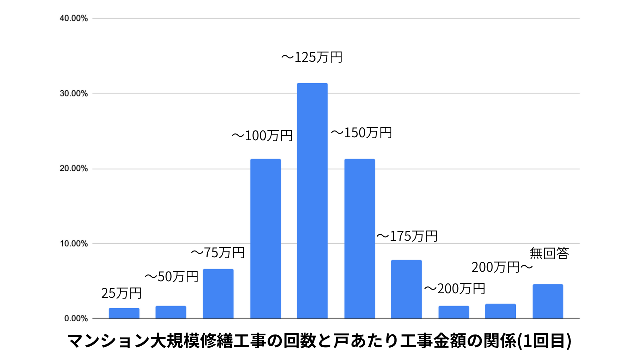 「令和3年度マンション大規模修繕工事に関する実態調査」によると、大規模修繕の費用は、戸あたり「100~125万円/戸」の割合が最も多く、次いで「75~100万円/戸」となっています。