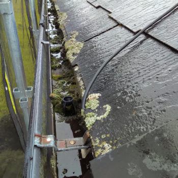 Q:写真だと伝わりにくいですが、ものすごい勢いで水が雨樋を伝っています。どうしてでしょう。