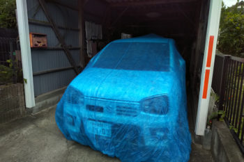 水しぶきが飛ばないよう、車庫の自動車はカバーして行います。