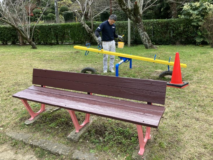 さて、ベンチや遊具、下塗りしたあとは上塗りを重ねていきます。