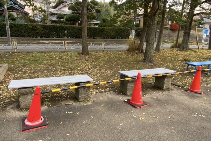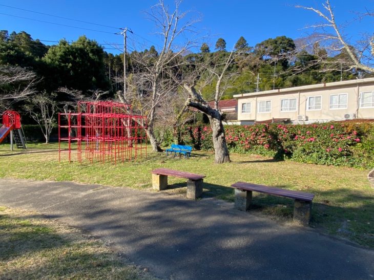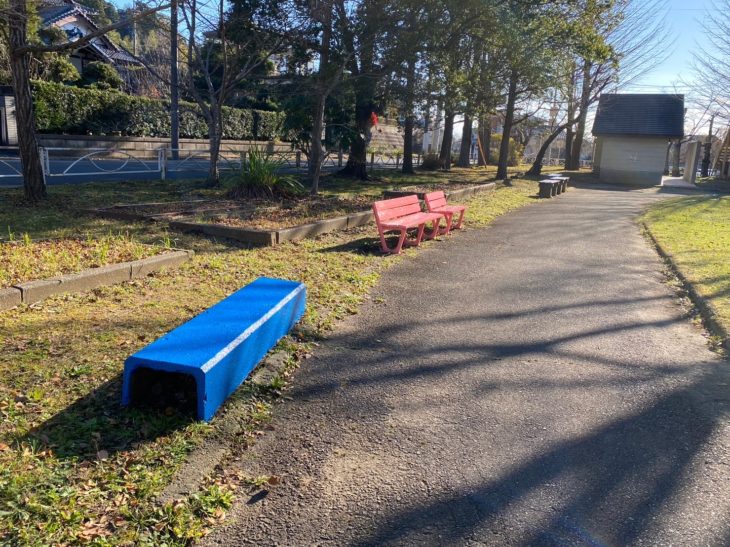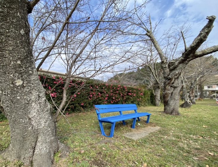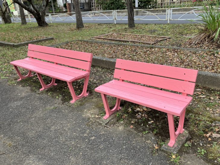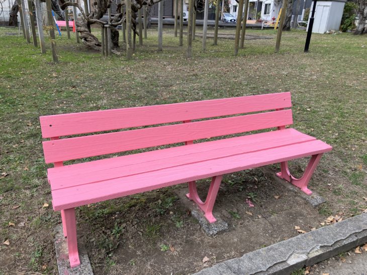 こちらのペアのベンチは さくら色になりました。公園の雰囲気を少し華やかに。差し色で、今は寒空の下、子どもたちの元気に寄り添うようにささやかながら温かみを。春、桜のころには同じ色調で周りの風景に溶け込み彩りの一助になりますように。