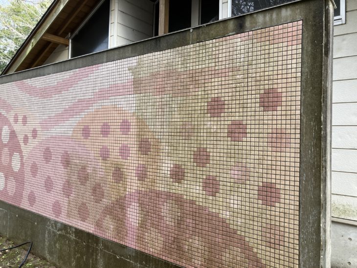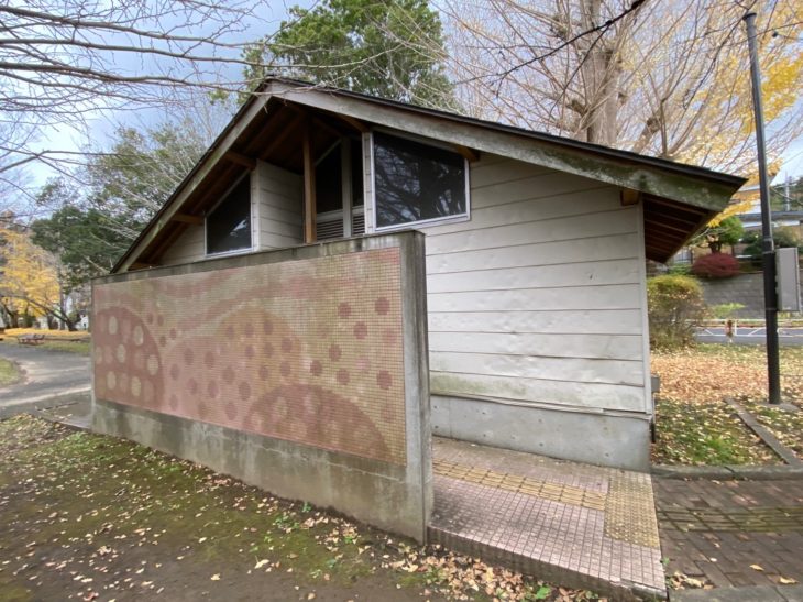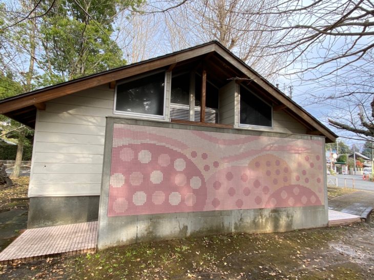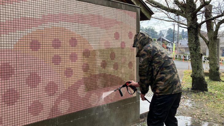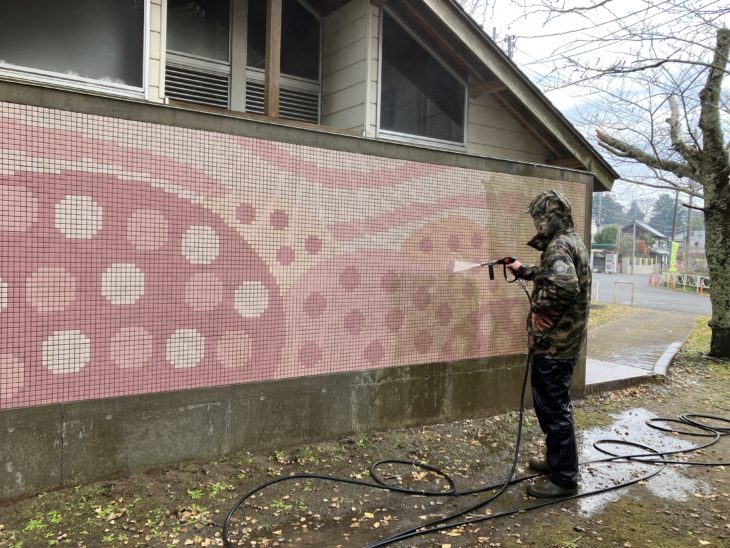 公園内のお手洗い 桜がデザインされた外壁の洗浄を行います。