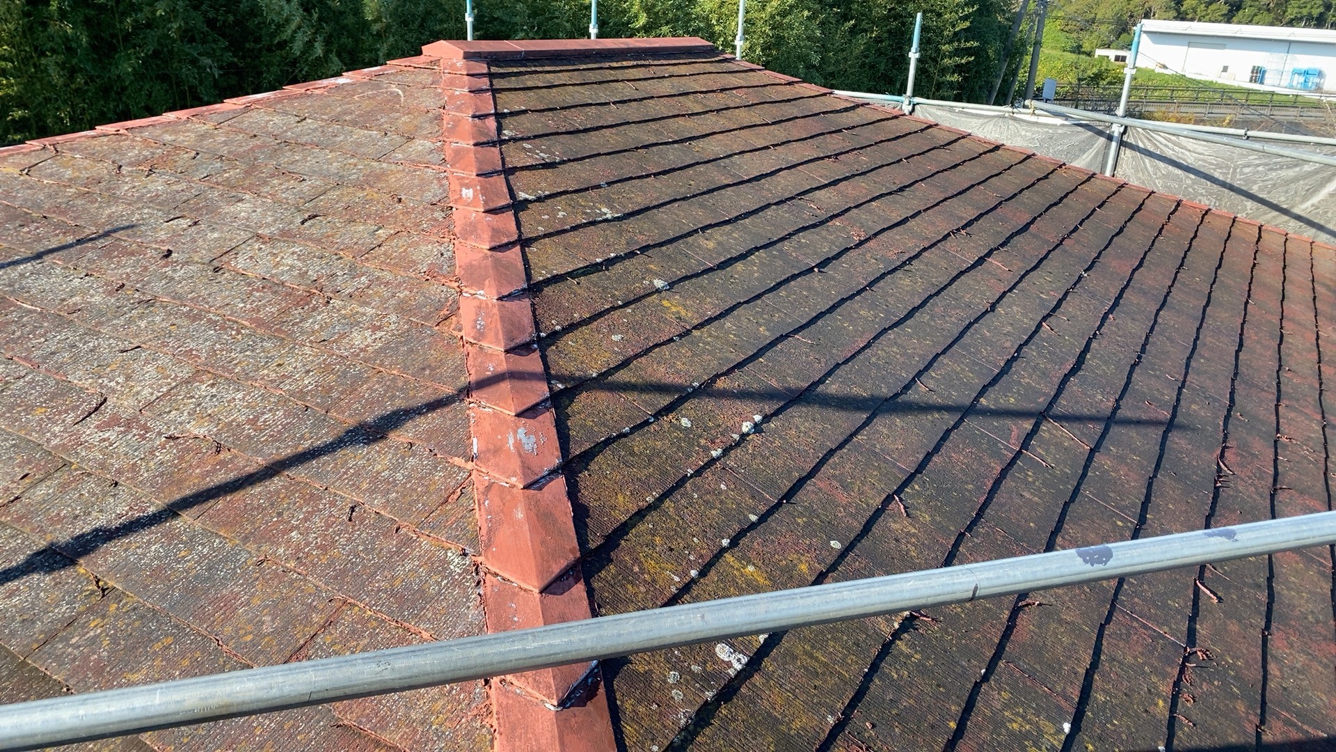こちらはソーラーパネルが設置されている屋根です。屋根の状態からソーラーパネルの脱着はせず、棟の釘増し打ちをして塗装でのメンテナンスをご提案いたしました。