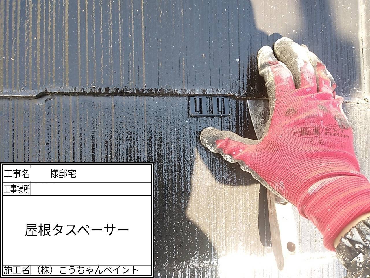 こちらの屋根は塗装のご提案をいたしました。「こうちゃんペイント」では雨水や水分を逃がすための隙間を作るタスペーサーを必ず取り付け塗装していきます。この工程を縁切りとも言います。スレート屋根は通気性のためにスレートが重なる部分に隙間を開ける必要があります。隙間がないと表面張力が働き水分が微細な隙間をつたって入り込んでしまう毛細管現象が起こり雨漏りにもつながる恐れがあるからです。(毛細管現象を防ぐため➤分かりやすい説明が日本防水協会で掲載されています。)