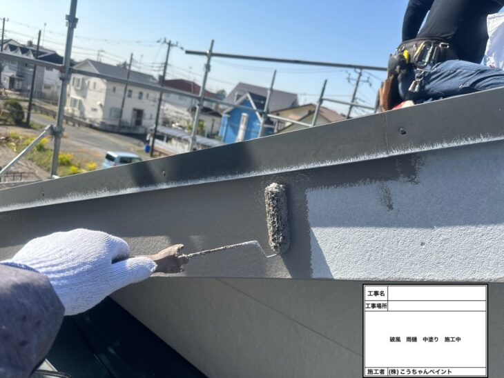 破風・雨樋中塗り施工中