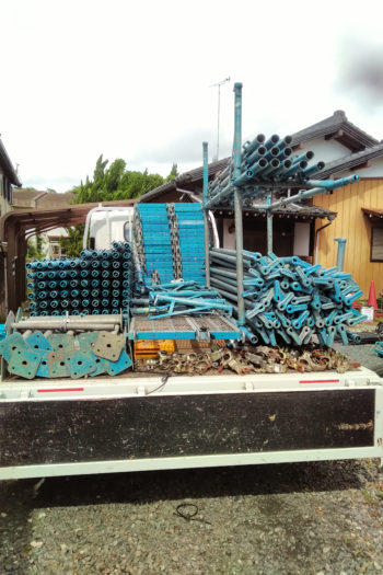 平屋のため高さはそこまで必要ありませんが、それでも1棟をぐるりと囲むとなると材料もトラック満載です。