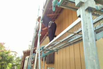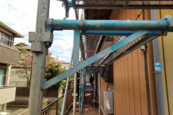 足場は外壁の塗装作業になくてはならないもの。高いところを塗るのに職人が脚立を動かしながら右往左往する必要がなくなり、落下防止のためにもなります。
