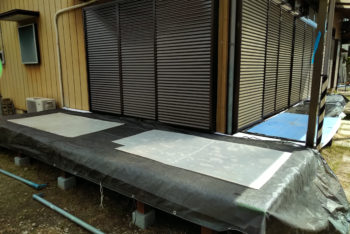 ウッドデッキのようなデリケートな場所にたてるときには、パネルなどでしっかり下処理。現場には傷ひとつ残しません!!