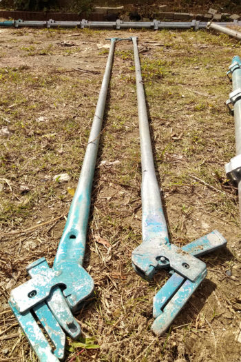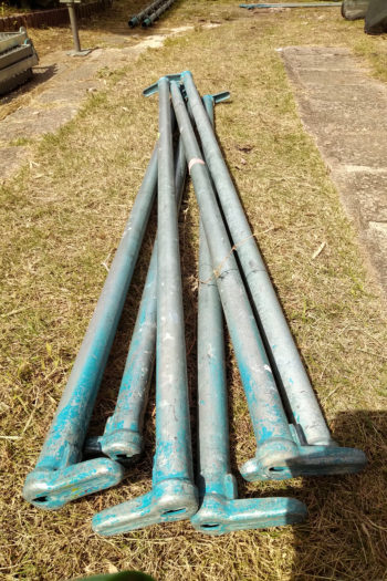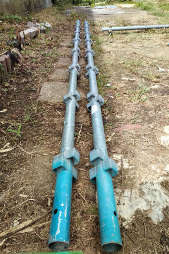 足場は鉄製のしっかりしたつくりをしていますから、とにかく重いです。一つ一つ手作業で庭に運び入れ、下から順に組んでいきます。