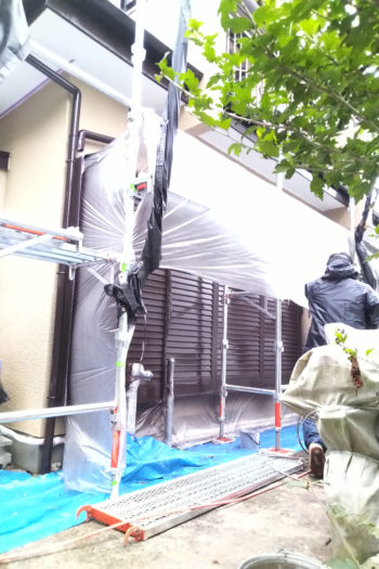 足場ごと包み込むように、雨戸に沿ってぐるりとビニールが張られています。まるでそこだけビニールハウス。養生※の一種だと思われますが、中ではどんなことがどのように行われているのでしょうか。※塗料のはみ出しや飛散を防ぐため大事な部分を覆うこと。