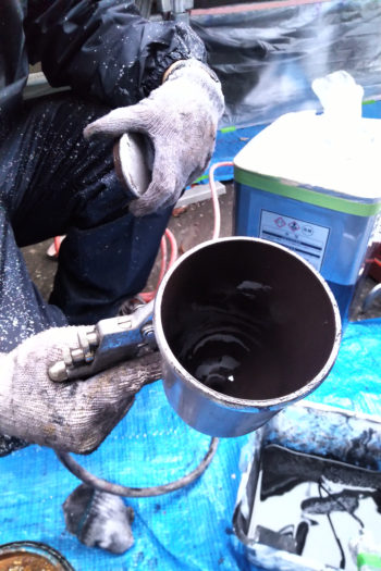 茶色い塗料が入っているのでこうするとコーヒーカップのようにも見えますが、これがスプレーです。底に噴霧機がついたカップのようなつくり。蓋をしてから人差し指でシュシュっとレバーを引くと、塗料がシュシュっと出てきます。この道具、雨戸のように蛇腹になっていてハケやローラーが入りづらい面を塗るのにとても効率的です。ただ、便利な一方で無駄な飛散がないよう細心の注意が求められます。それでこのビニールハウスのような養生が必要だったのです。