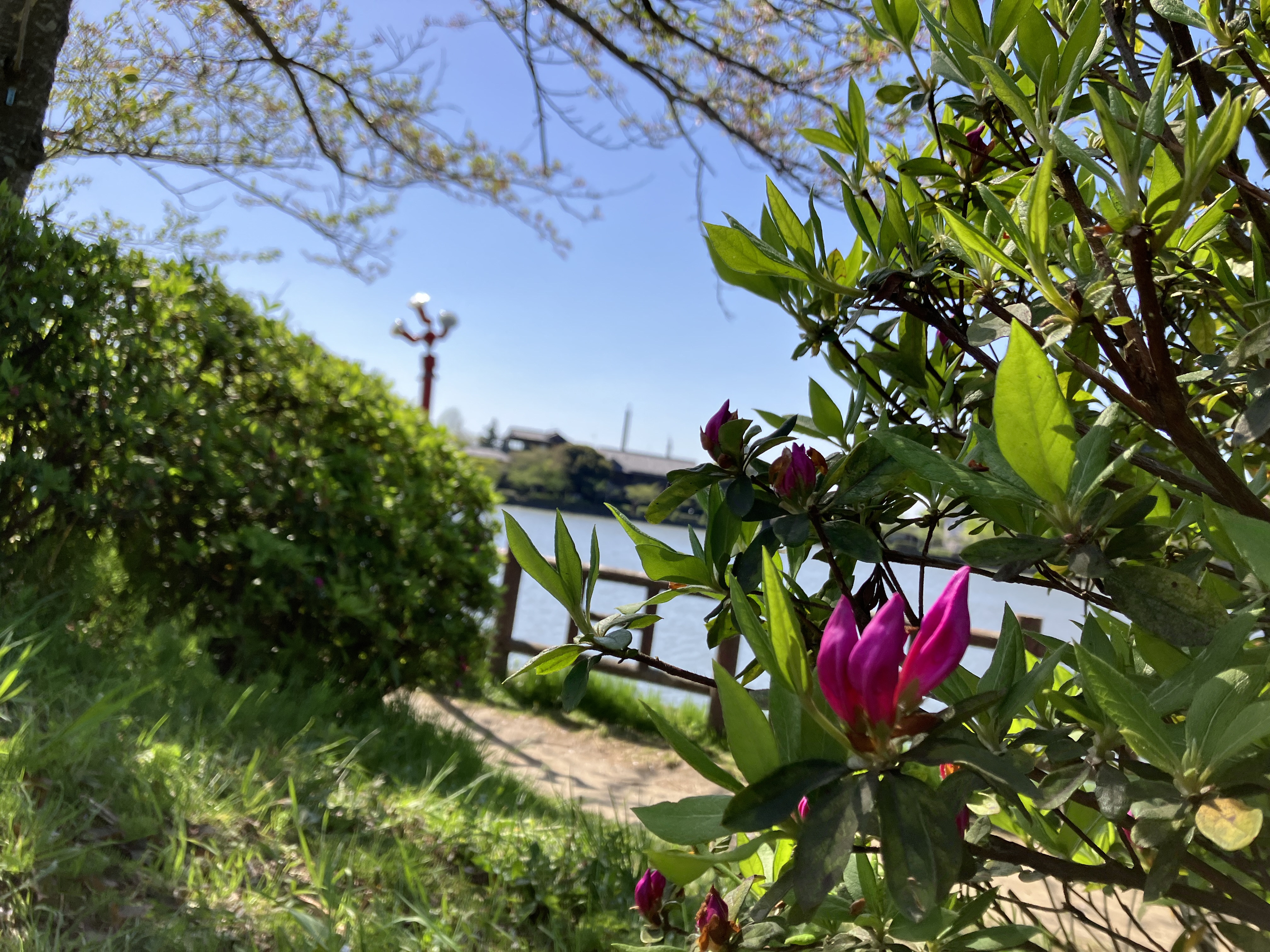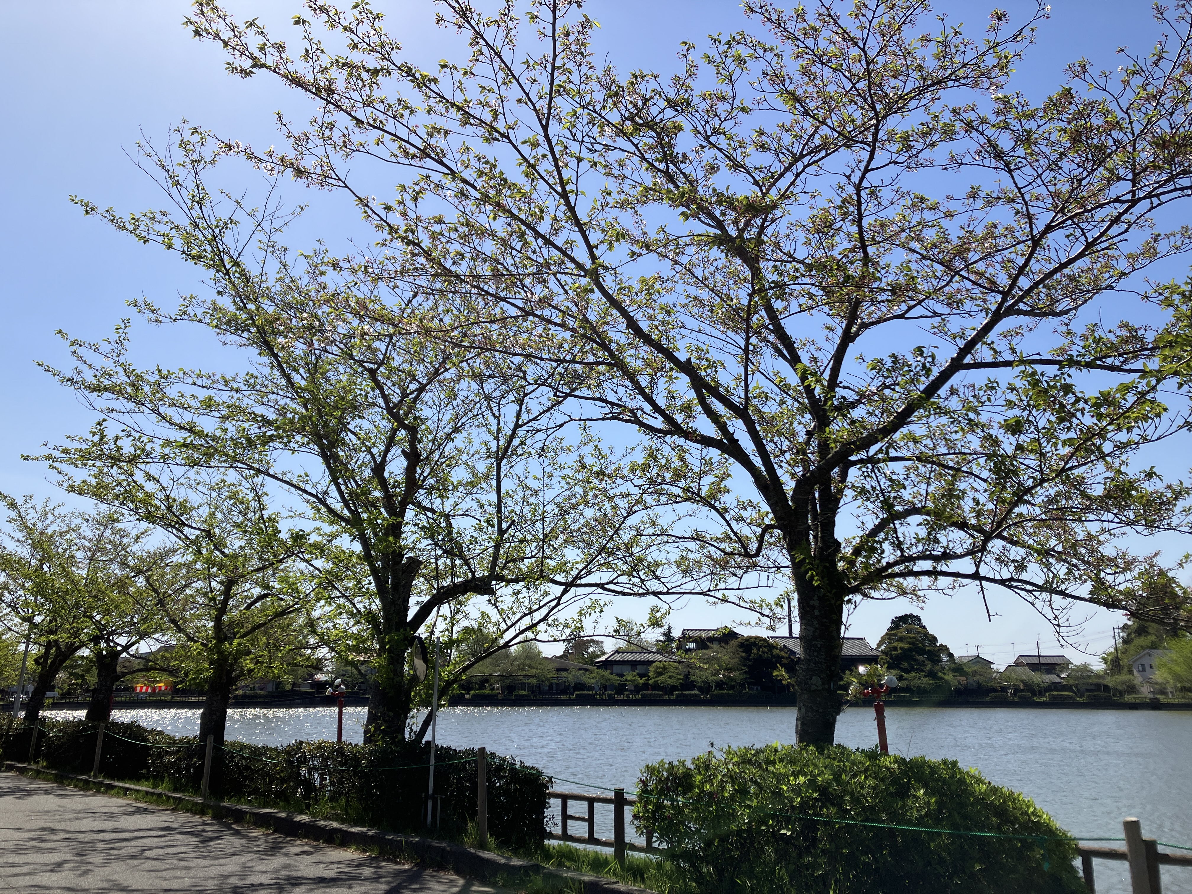 葉桜となるこの頃は、湖面には桜の花びらが風に寄せられた花筏(はないかだ)や空を舞う花吹雪にまた風情を感じます。