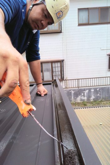 当初は金属製の屋根が激しく錆びついていましたので、腐食の防止も兼ねて塗り替えています。早朝に、まず 錆止めの塗装(下の写真)を行いました。光沢のない黒っぽい塗装です。