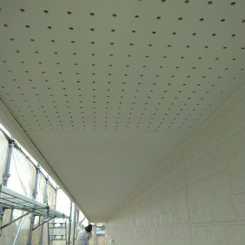 午前中に上塗りを終え、夕方には飛散防止のため窓を覆っている養生シートも剥がしました。午後からは軒天※と破風板の中塗り。明日は軒天と破風板に上塗りを行います。