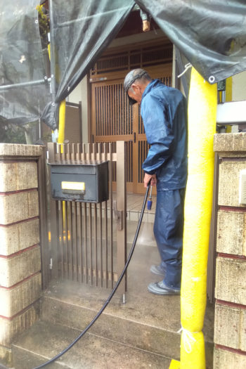 おととい足場をたてさせていただきまして、塗装前の高圧水洗いを昨日のうちに行いました(↓昨日の水洗いの様子)。音や水しぶきでご不便をおかけ致しましたが、ご協力ありがとうございました。