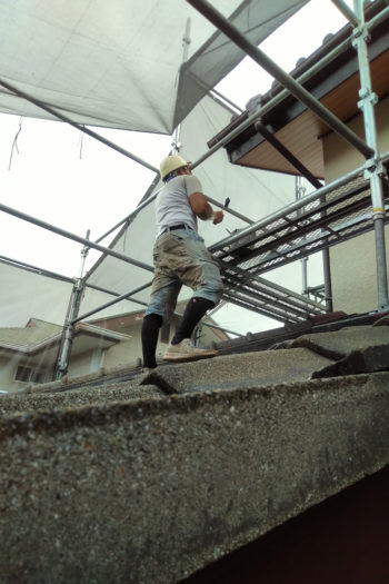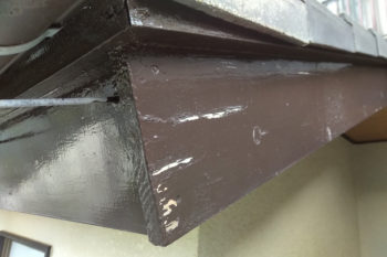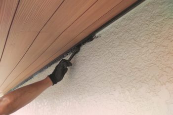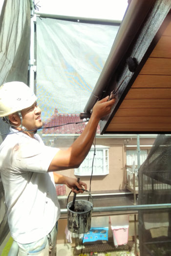 最後に全ての養生シートを剥がしたときに、異なる塗料の境目をきれいな仕上がりにするための、これも一種の下準備。今日も現場では、細やかな神経を細かいところまで行き届かせています。