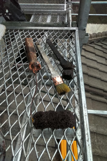 下の写真は職人が使っているローラーやハケ。今日は3種類を使い分け、狭いところまでしっかり塗り込んでいます!!