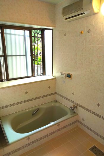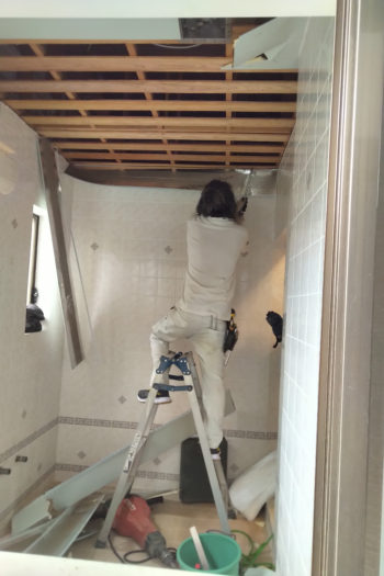 こちらのお家もリフォームの一環。タイルが可愛いレトロな雰囲気の浴室ではありますが、最新の設備一式を導入するにあたり、まずはもったいないのですが壁から天井、浴槽、扉まで、今あるもの全てを撤去してまいります。