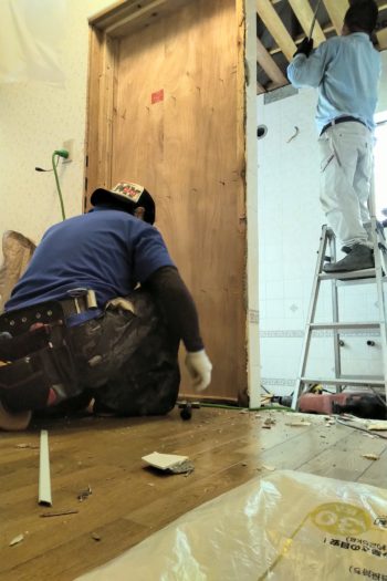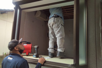 出窓のガラスもいったん外しました。作業も4人がかり。手際よく作業を進めて今日のところは撤去するべきものを撤去し、後日の本工事に備えます。