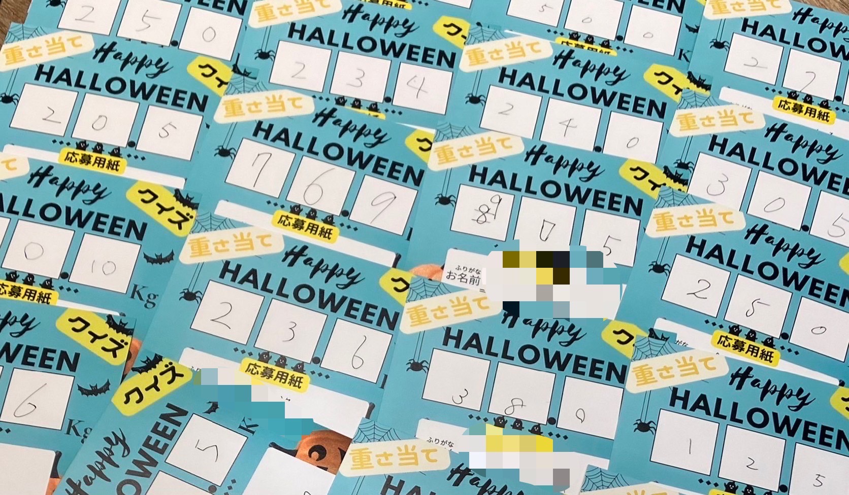 かぼちゃの重さ当てクイズ、ぴったり賞は出るでしょうか。かぼちゃさんには体重計にのっていただきます。