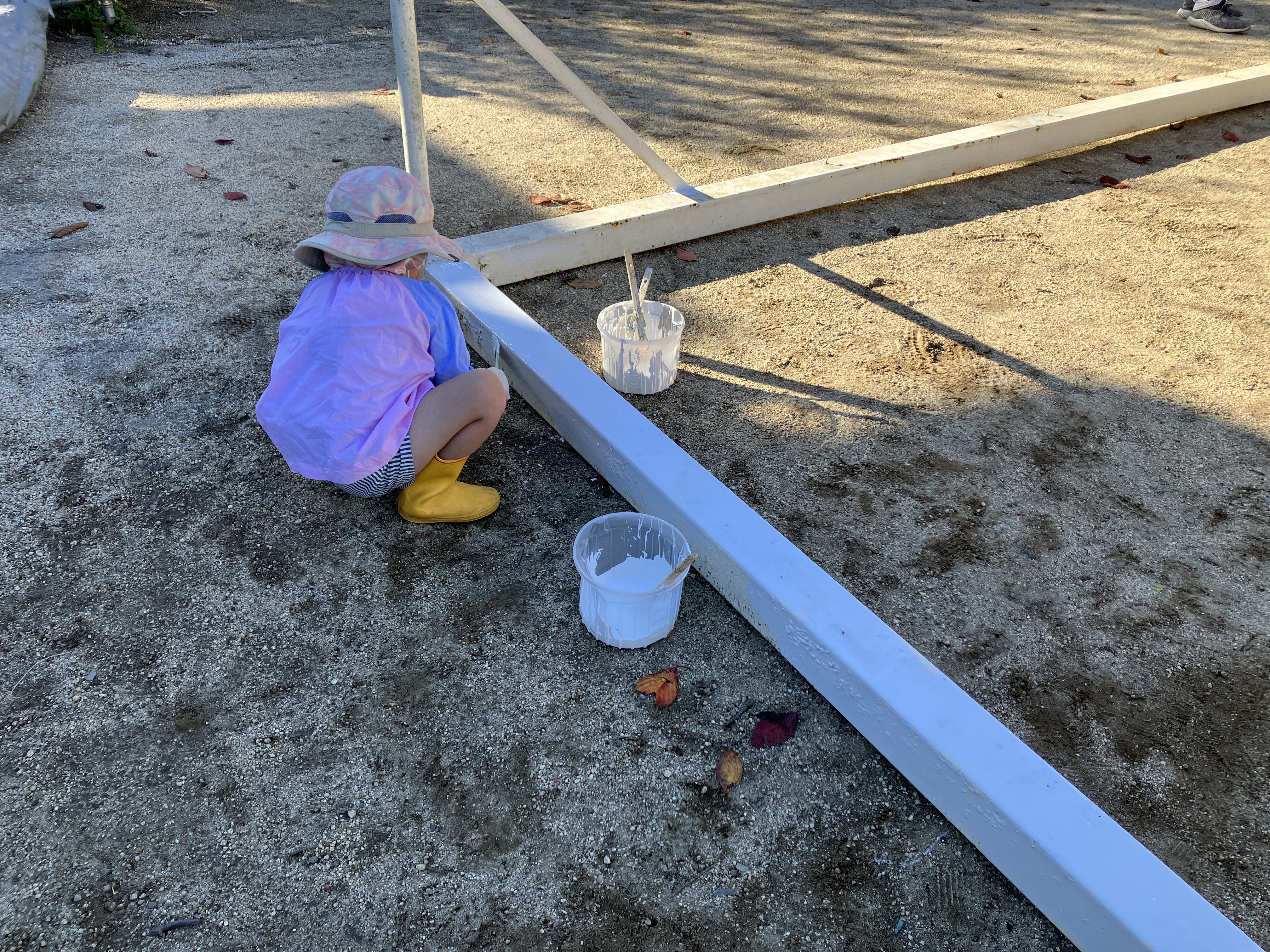 「ブランコ塗りたいひとー?!」と「はーい!」と手が上がり、希望をうかがいながら塗装箇所を確認していきました。