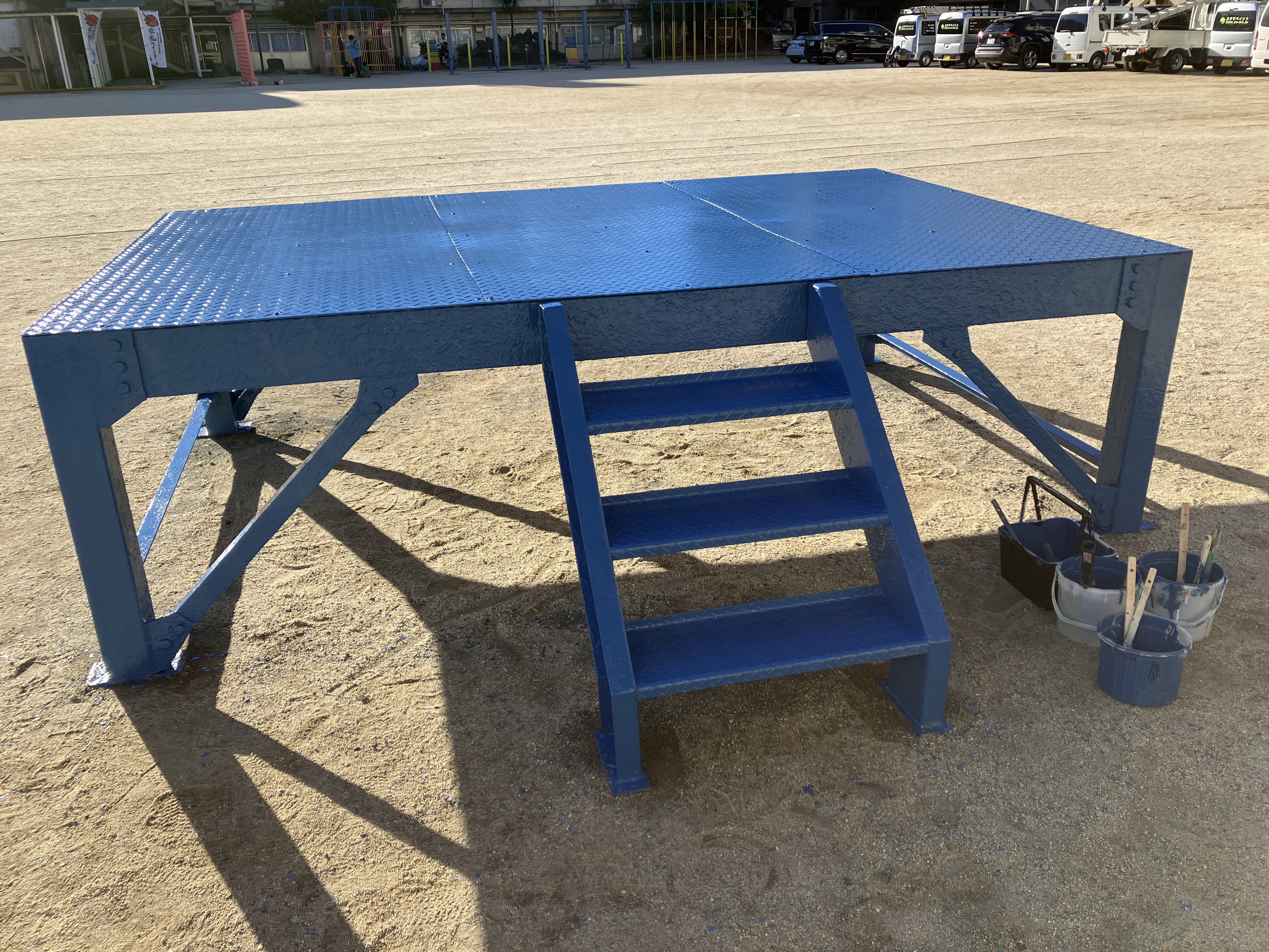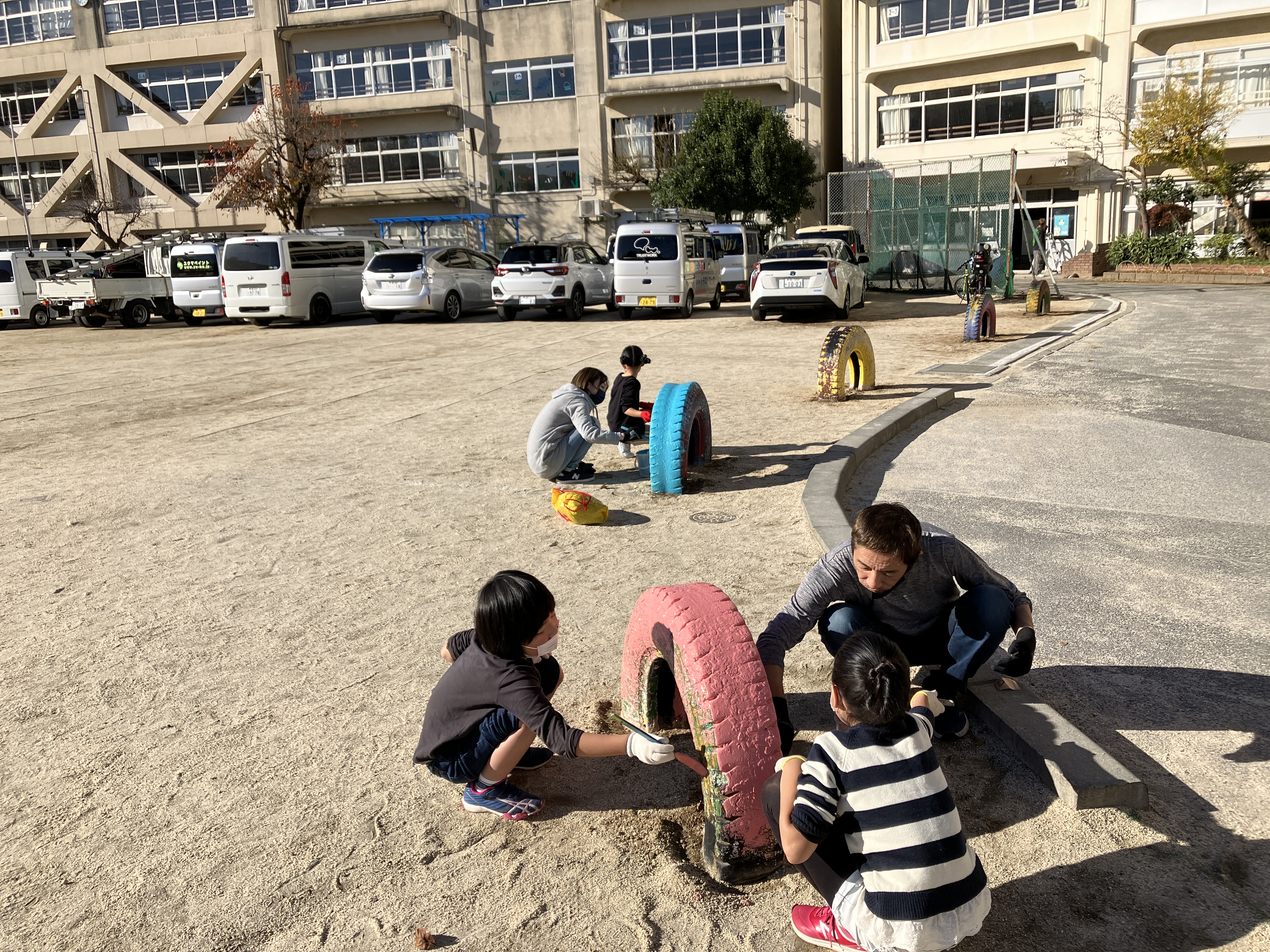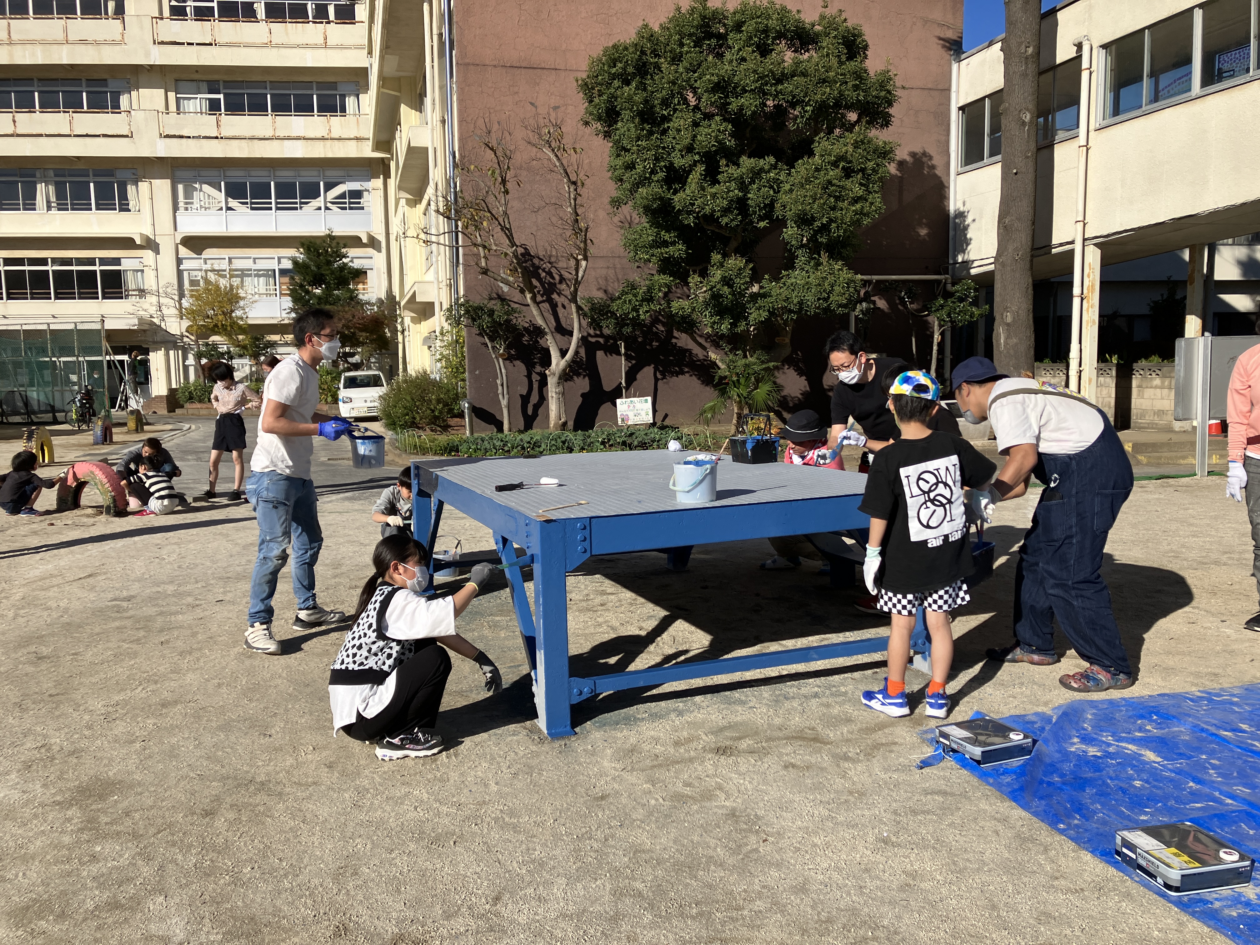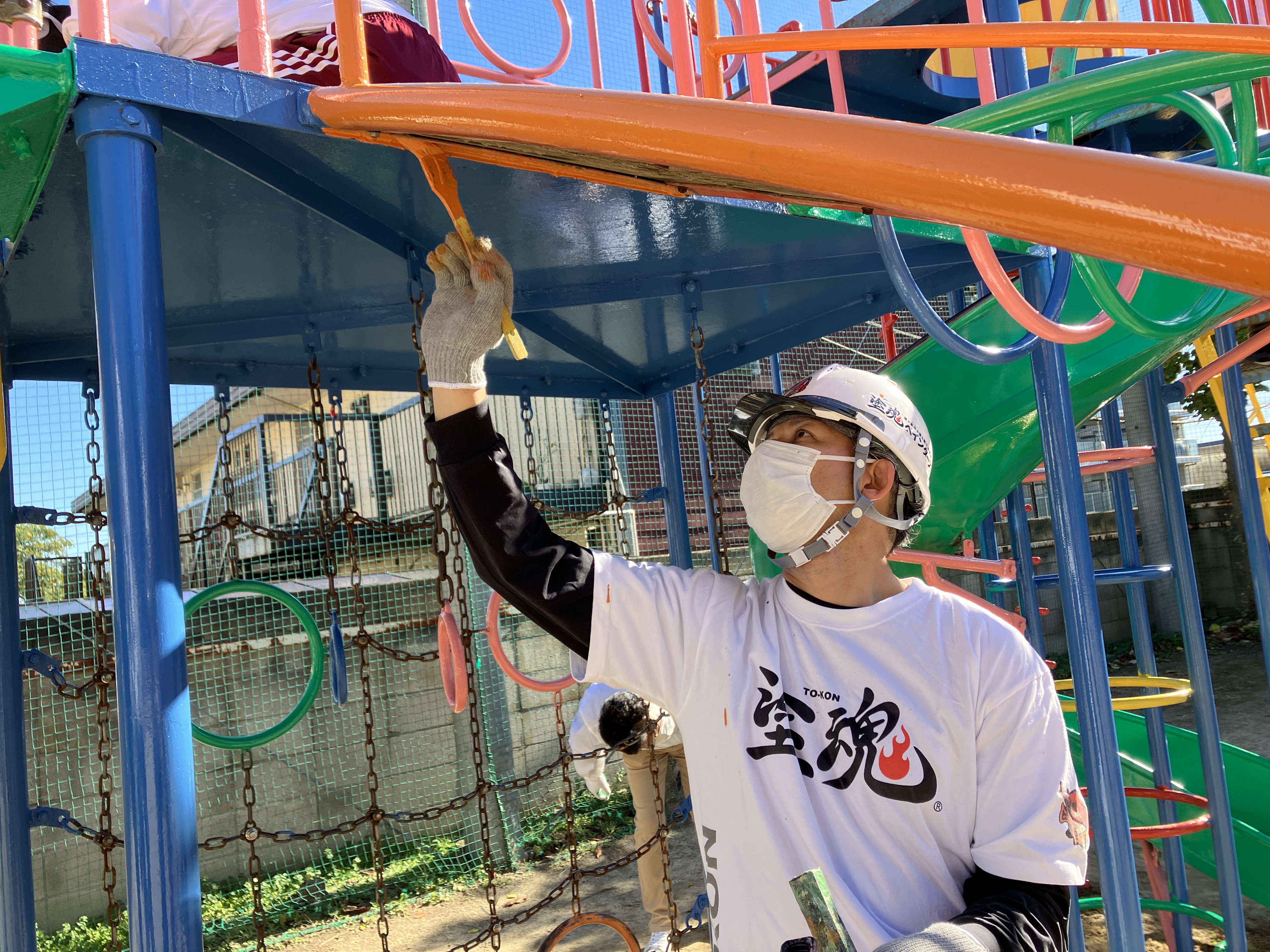 午前中は塗魂ペインターズのメンバーで塗装が難しい遊具や下地処理をして、PTAの方々と児童のみなさんをお迎えする準備を整えていきます。