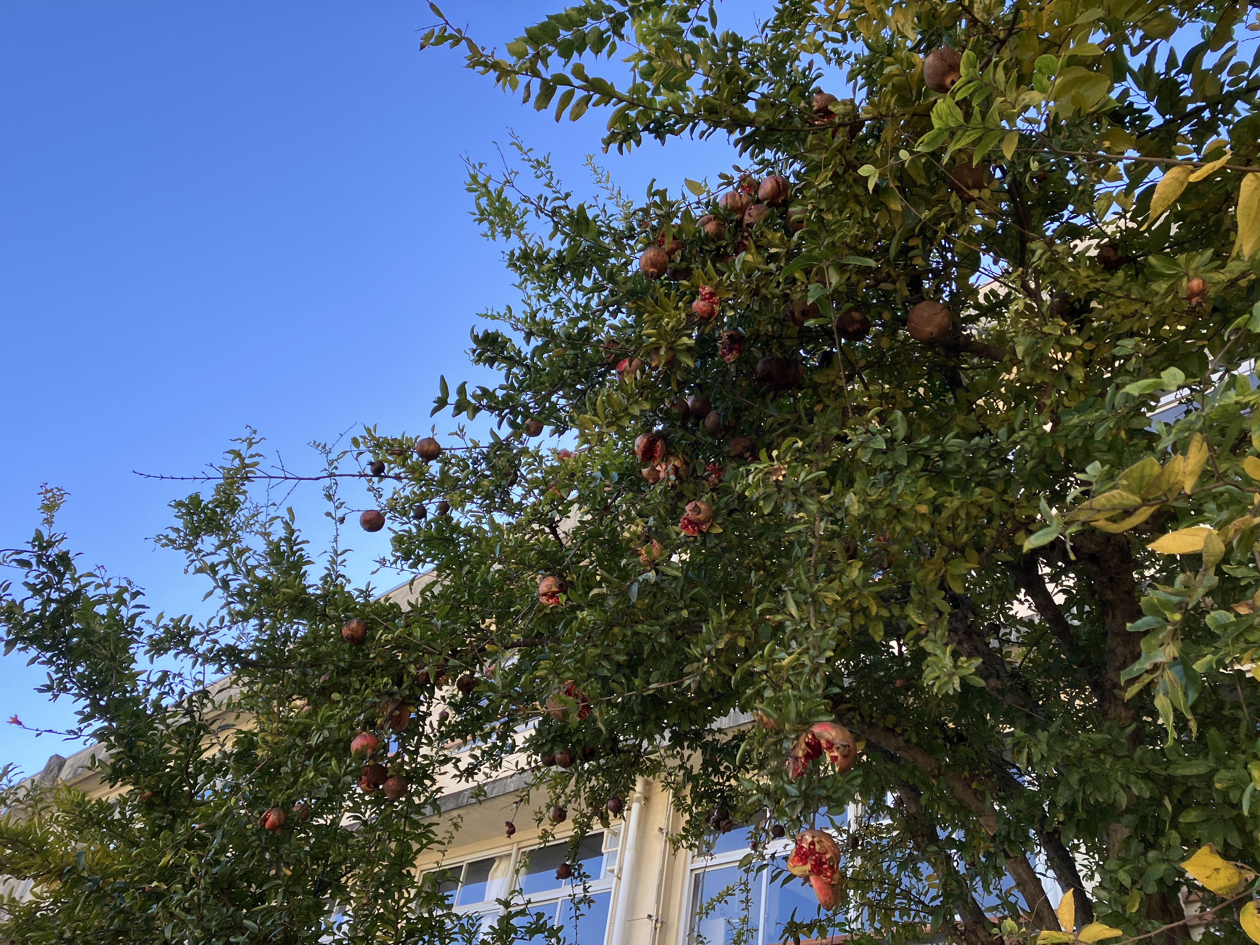 キンカンのほか、真っ赤なざくろも枝がたわむほどに実をつけていました。