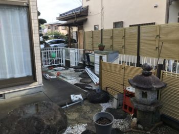 足場の資材が庭に次々と運び入れられていきます。仕上がりが楽しみです!