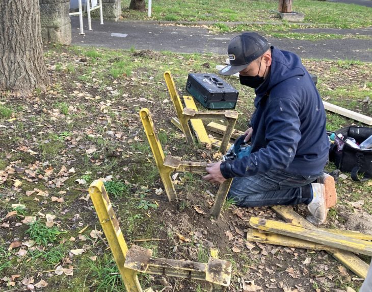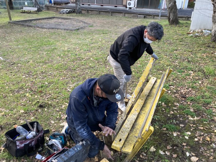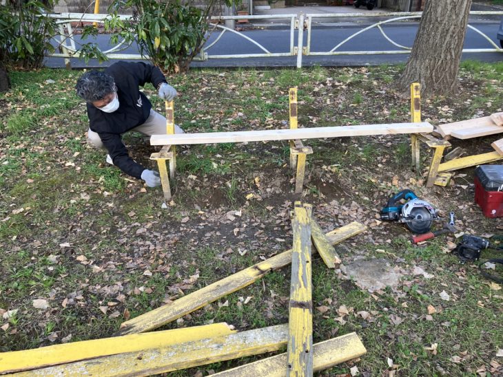 壊れかけのBench の修復の補助をしながら見守りながら塗装の段取り打合せです。