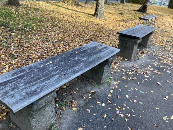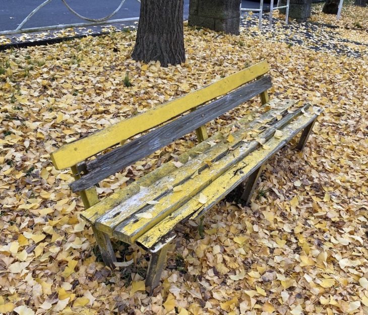 イチョウの落葉に囲まれ同じ色調のどこか風情のある朽ちたベンチ。