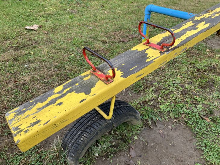 シーソーにとって塗膜の剥離は よく遊んでもらえた勲章です。下地の木部を守るためにも こちらも塗装していきます。