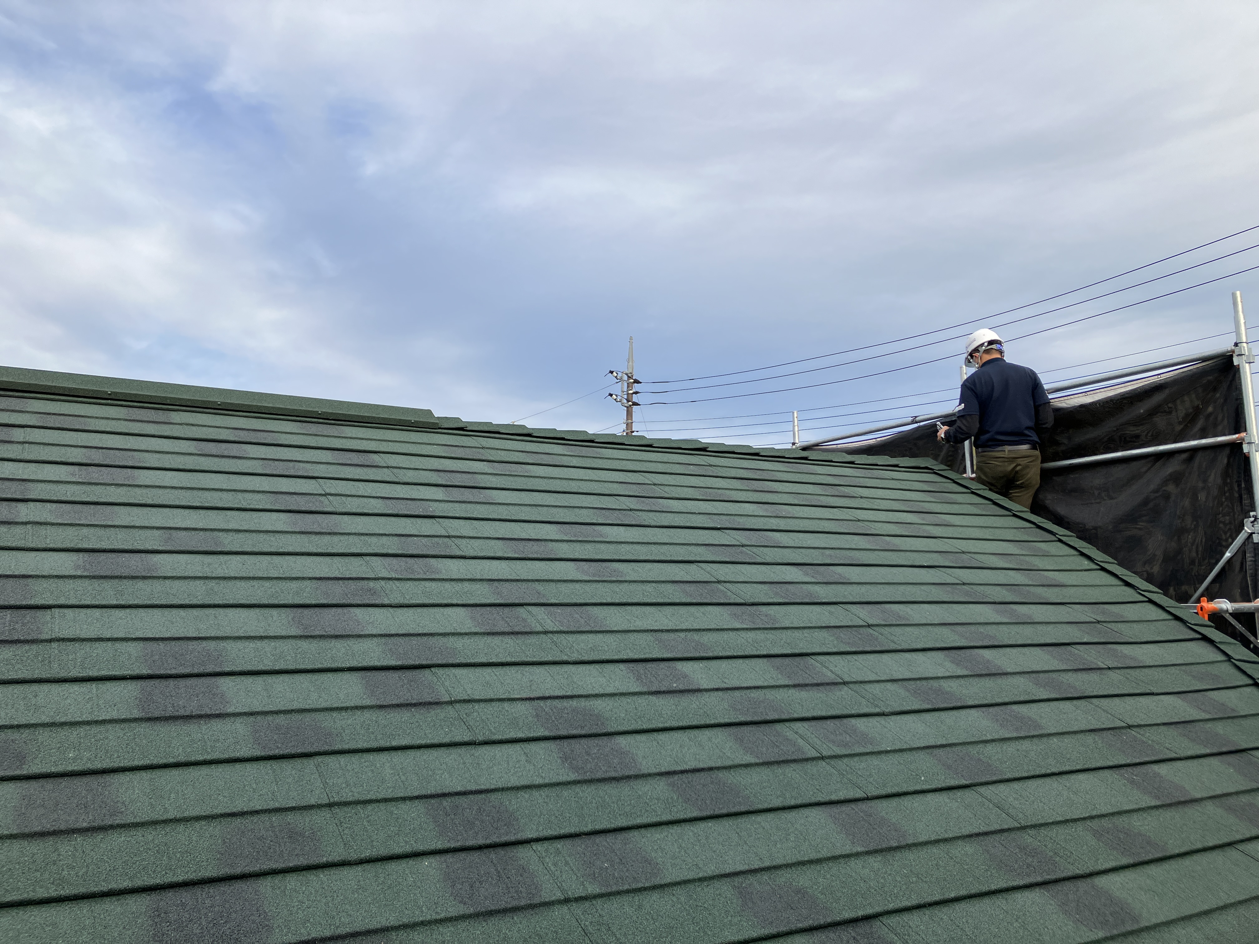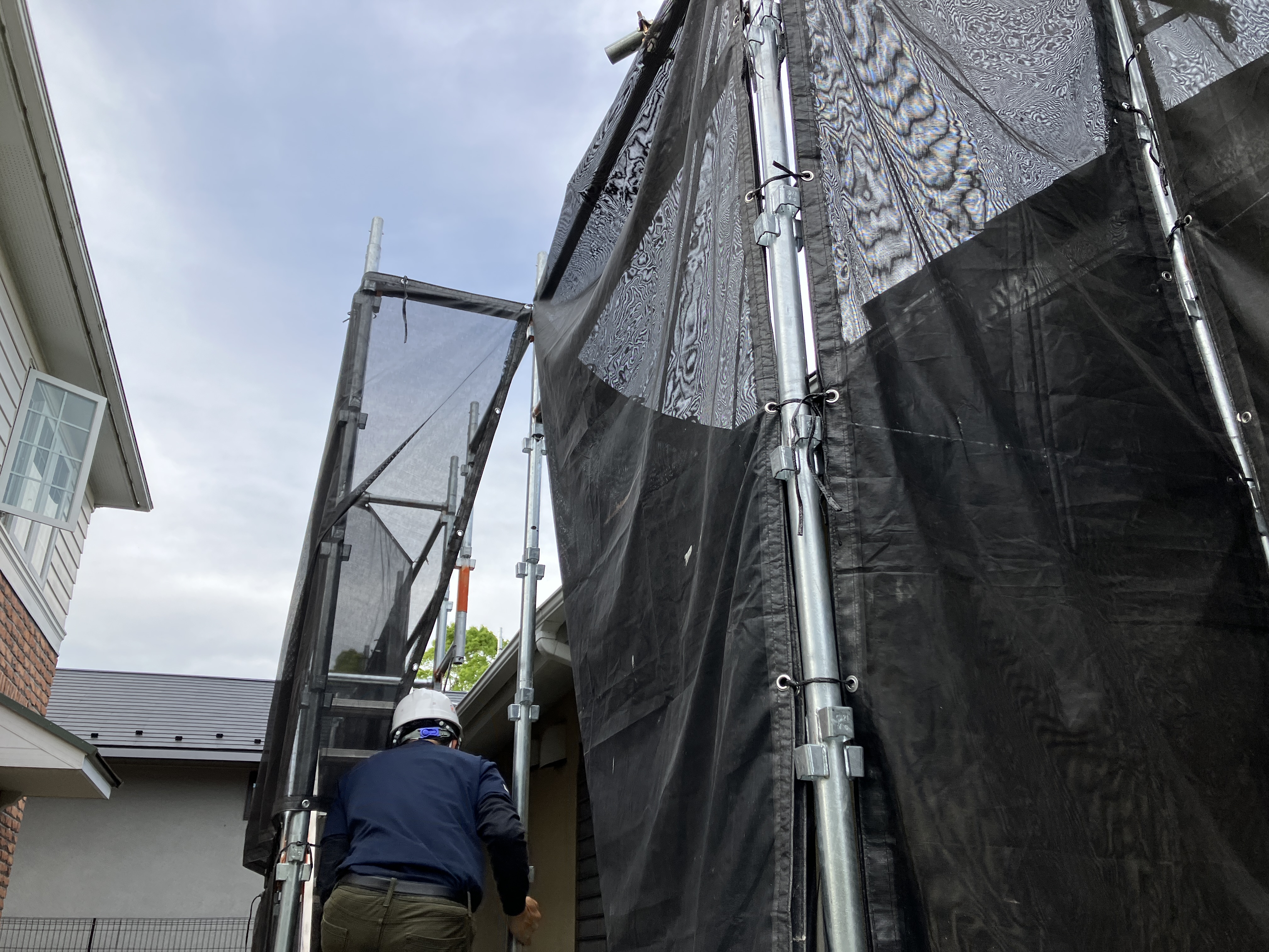 足場を颯爽と登っていきます。こちらは屋根カバー工事のお住まいです。施工完了の連絡を受け、早速、社長こうちゃんが駆けつけました。