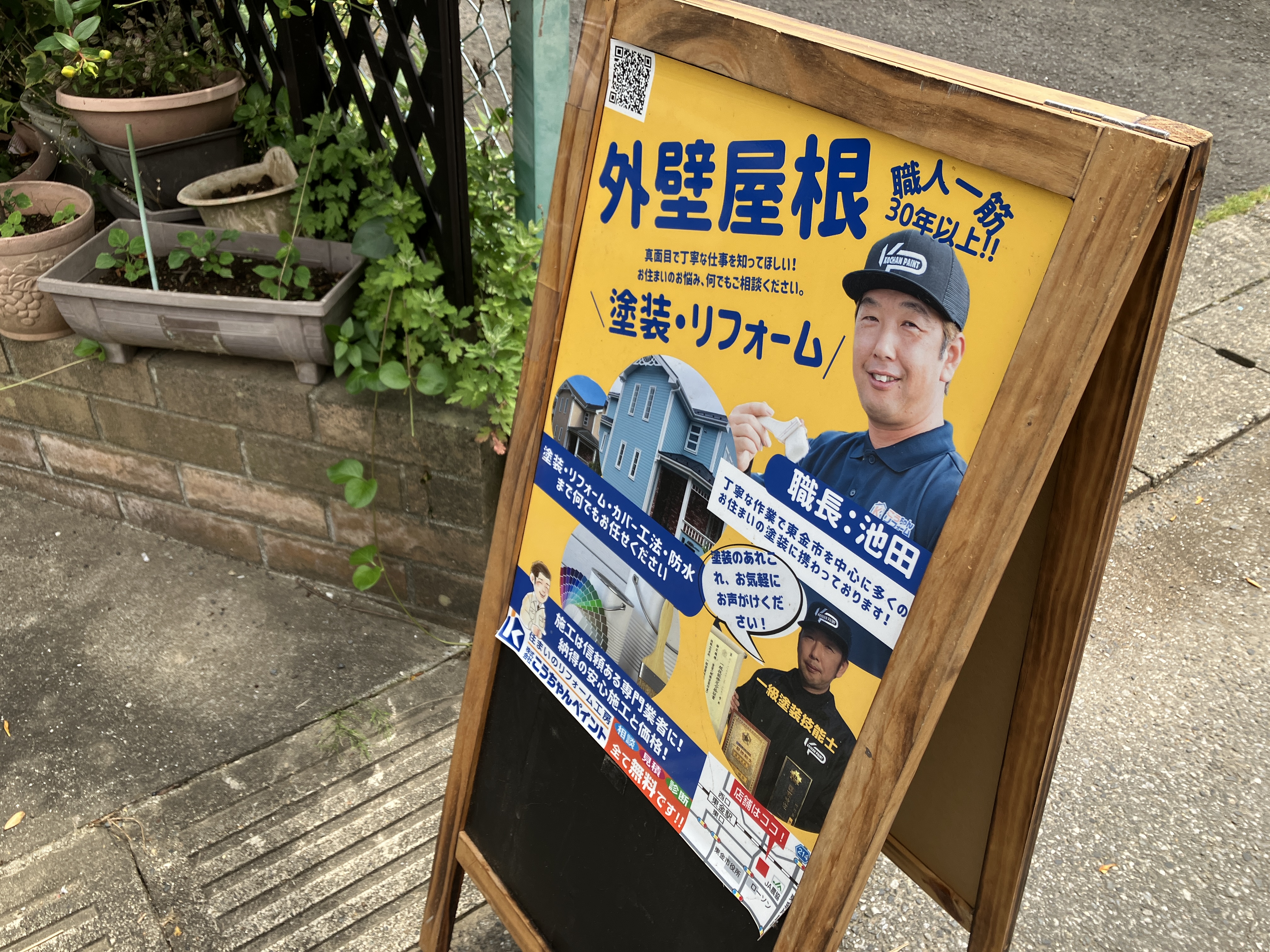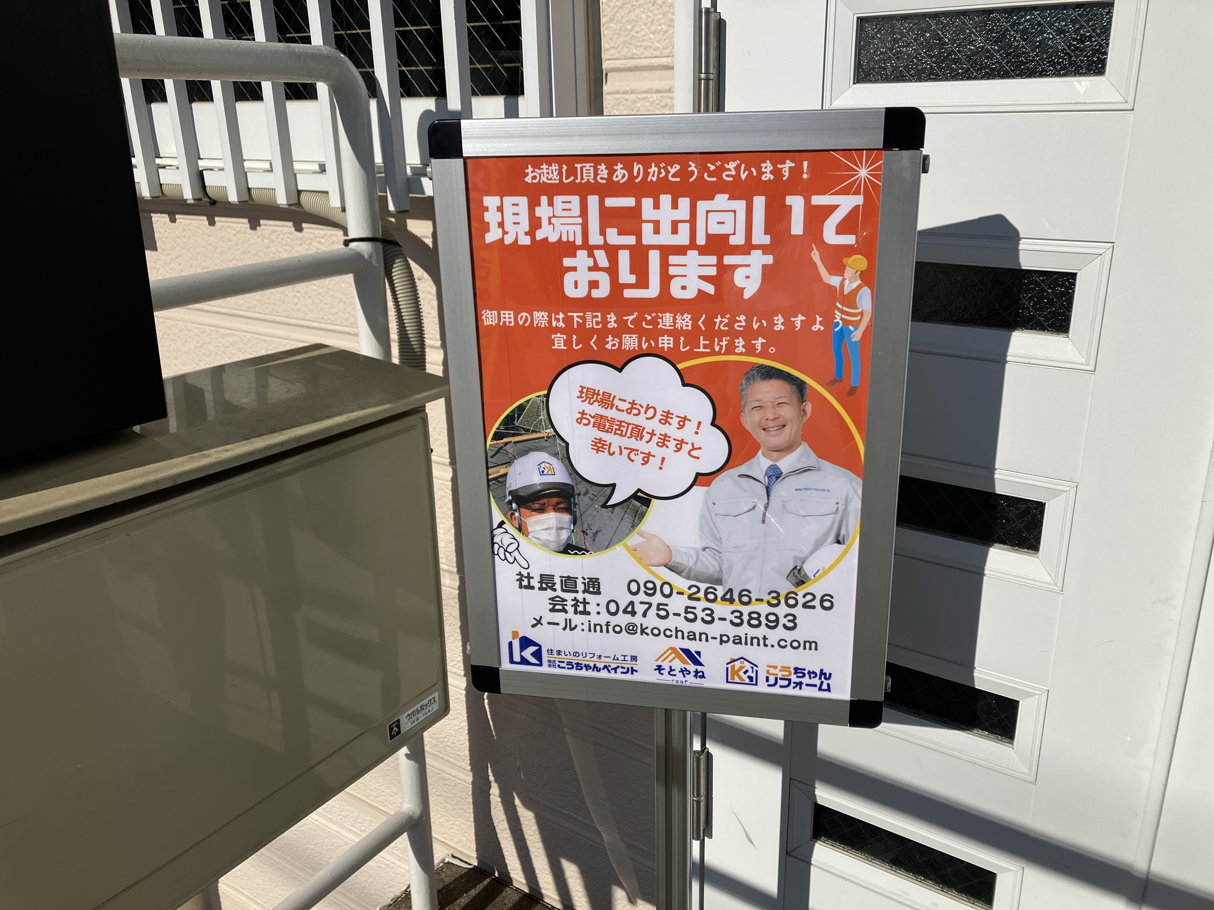 こうちゃんペイントは地元企業として東金の地を拠点に近隣地域のお客様に喜んでいただけるよう、外壁塗装、屋根塗装、屋根カバー工事、リフォームなどお住まい全般的に施工を承っております。ご相談等ありましたら、こちらの看板をご覧いただきお電話いただければと思います。