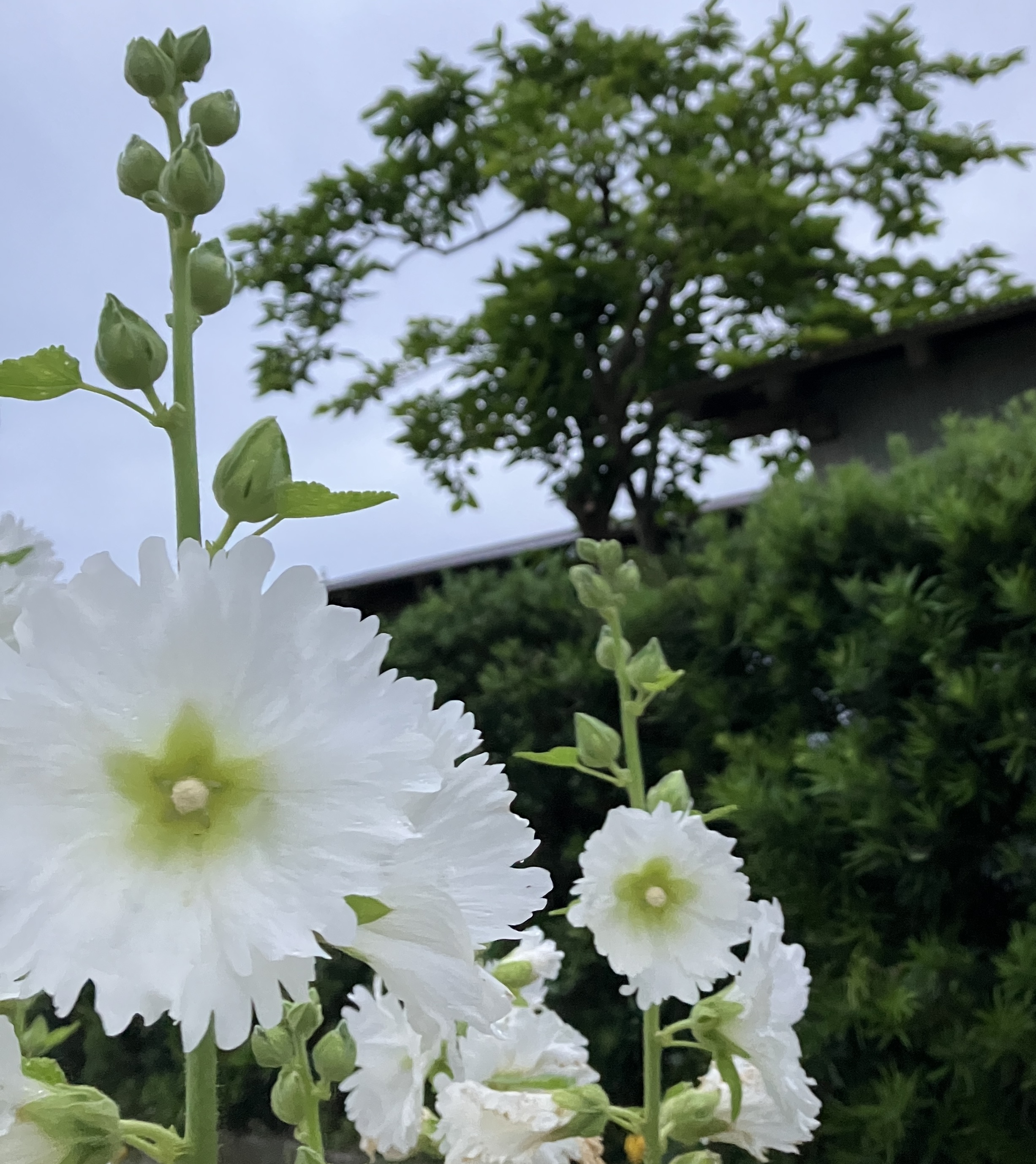 現場まわりの道中、曇り空のなか凛とした様子で白いタチアオイが咲いていました。梅雨入りのころに花が咲きはじめ、一番上まで花が咲くと梅雨明けのころと言われています。