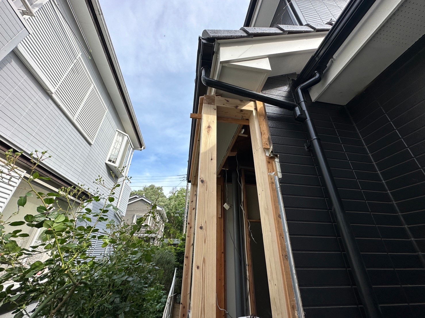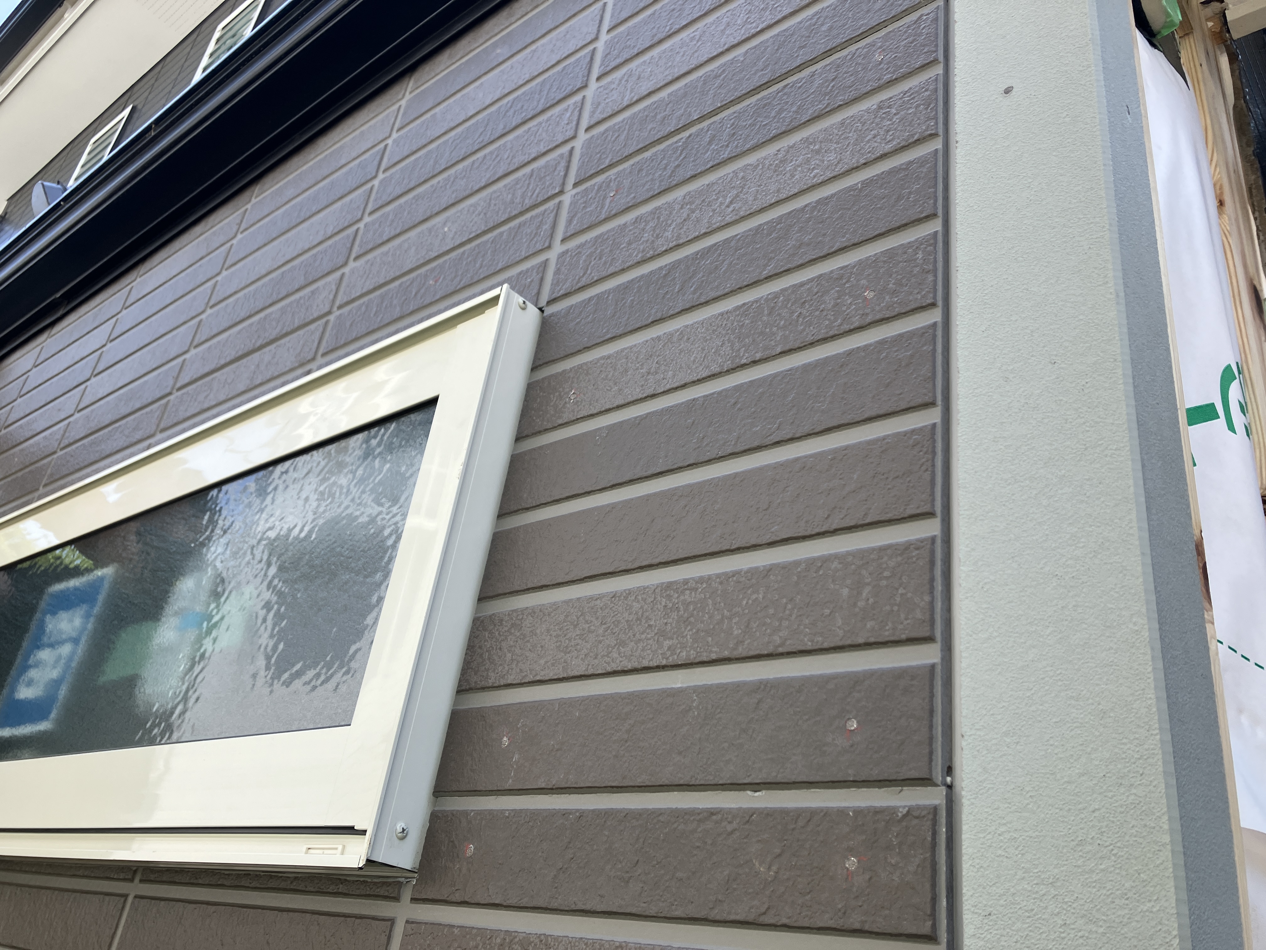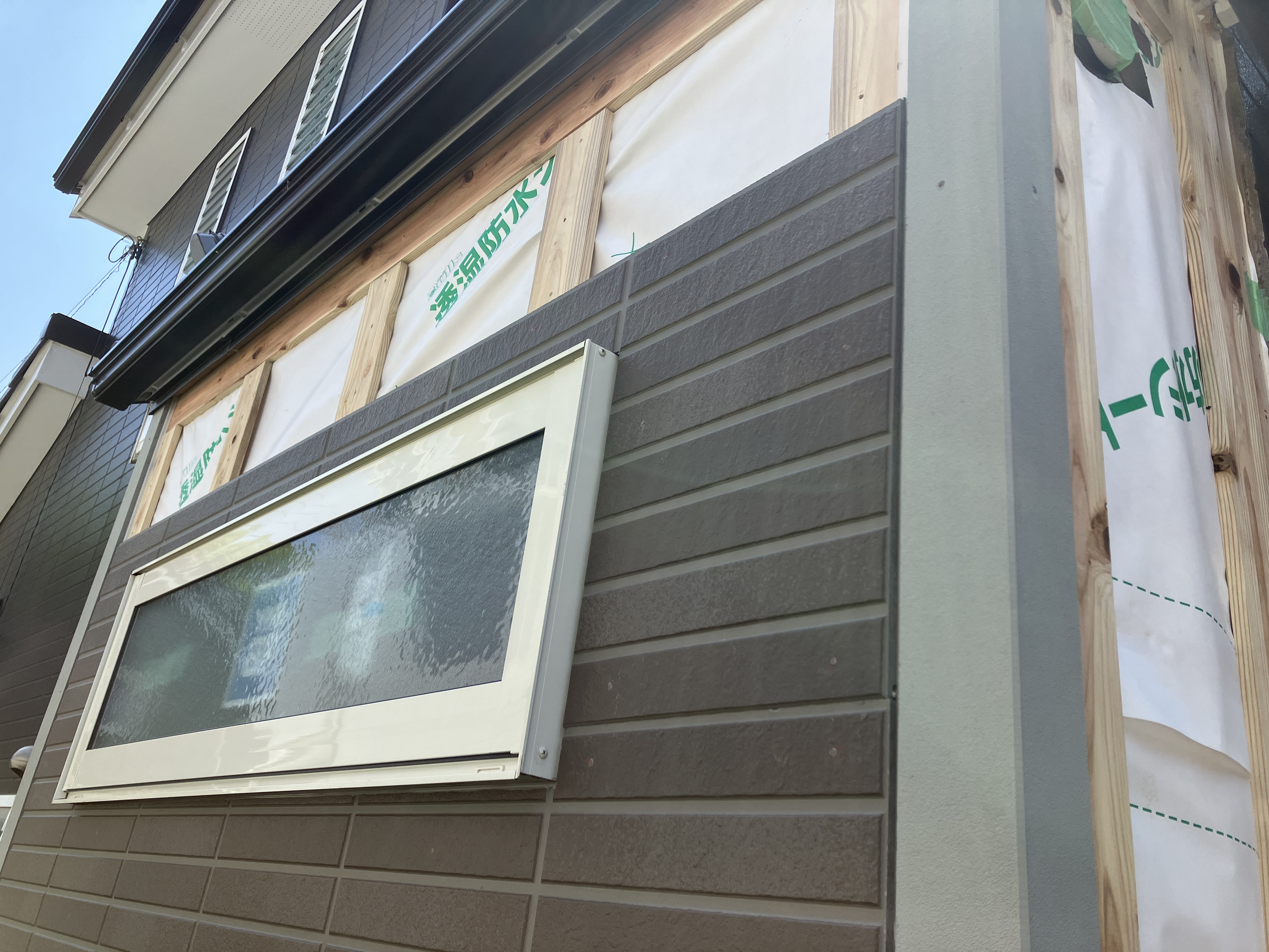 窓のある外壁面は完成しました。きれいに仕上がりました。続けて側面外壁にサイディング張りを行っていきます。