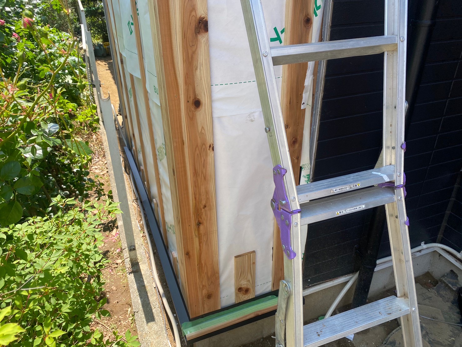 基礎のコンクリートのすぐ上にある「水切り」も設置されています。サイディングを張る準備が整っていきます。