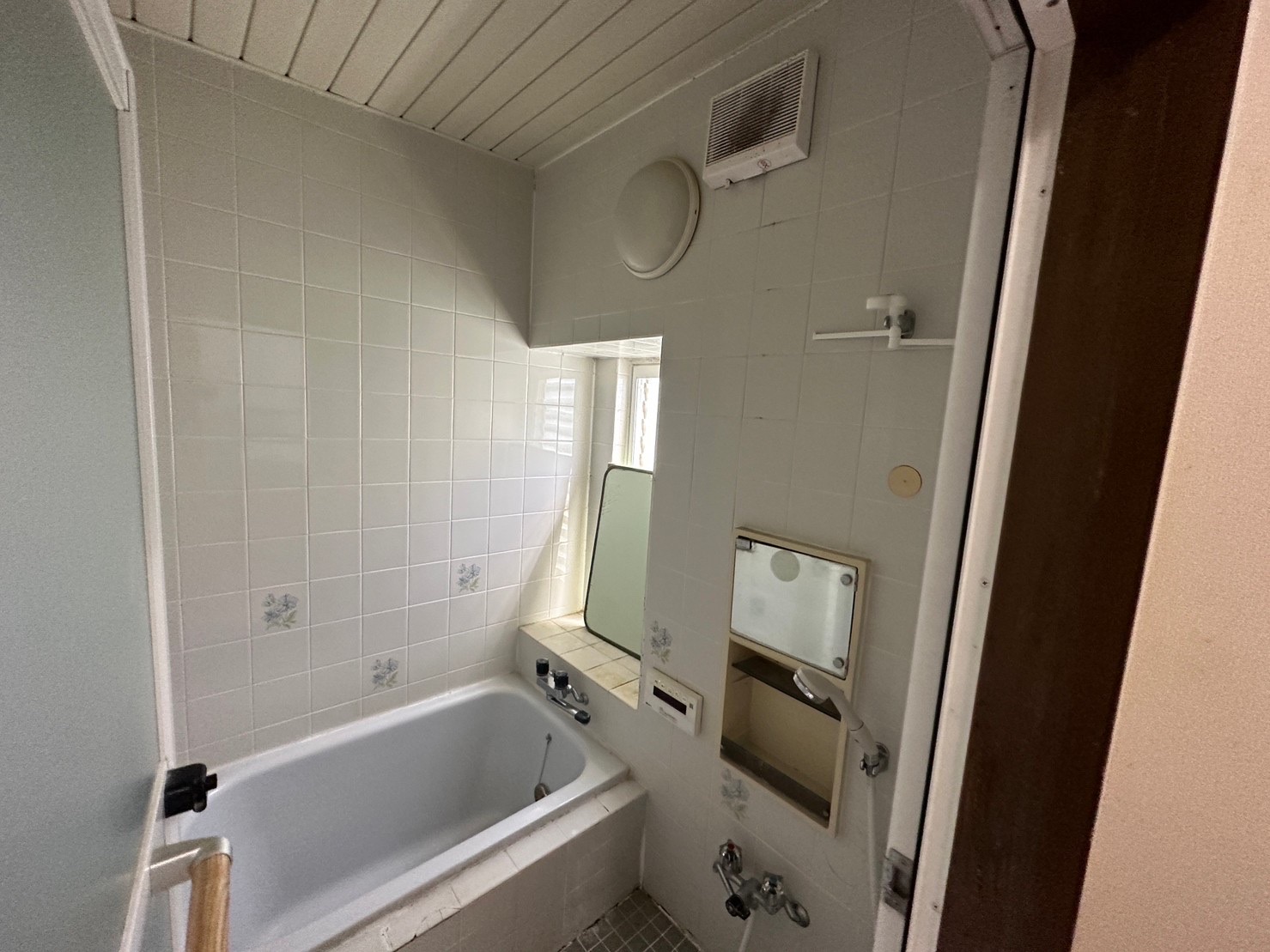 こちらはリフォーム前の浴室です。足を延ばして湯船につかりたいというご要望にお応えして、浴槽のサイズアップ、そして浴室も外へ広げてゆったりとした空間へとリフォームすることといたしました。