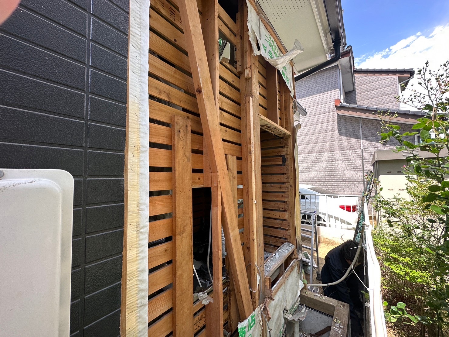 基礎が完成し、外壁を作る土台ができれば、既存の壁の解体となります。すぐに外壁を作っていくために、晴れの日を選び、一気に解体し外壁設置工事を行いました。