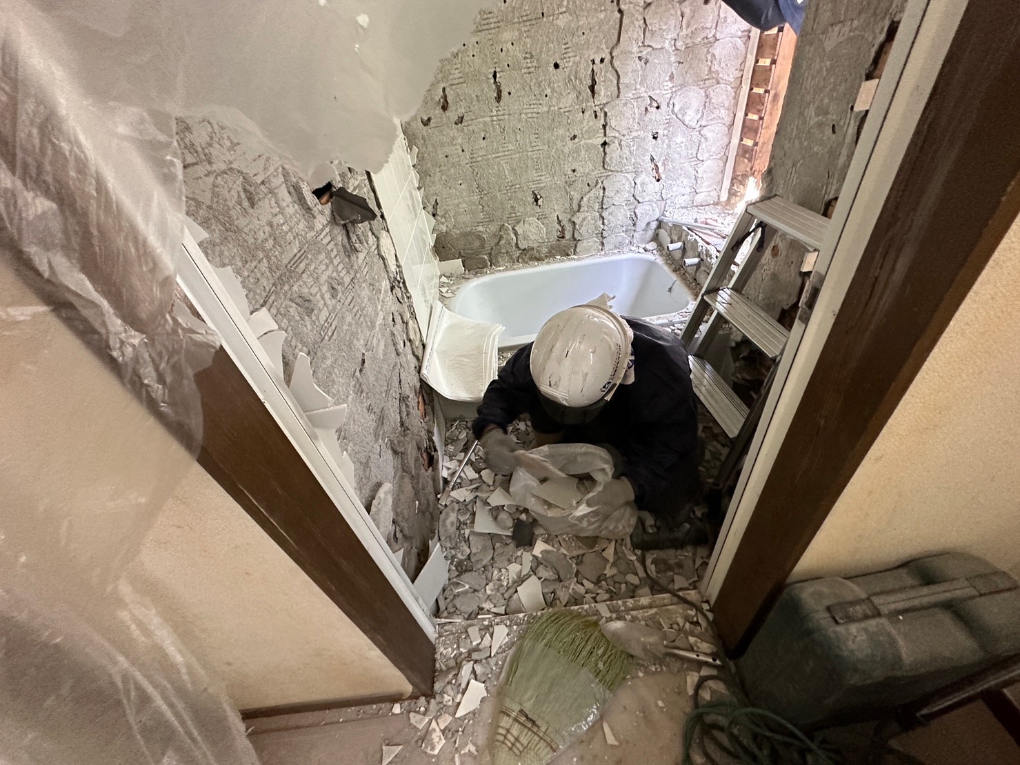 こちらは屋内での解体作業の様子です。浴室を広げていくために、またユニットバス設置のために既存の部分を解体していきます。室内に影響がないようにビニールで養生をして作業を進めます。作業にあたる際にもしっかりと粉塵マスクをつけ手順をおいながら安全に行っていきます。