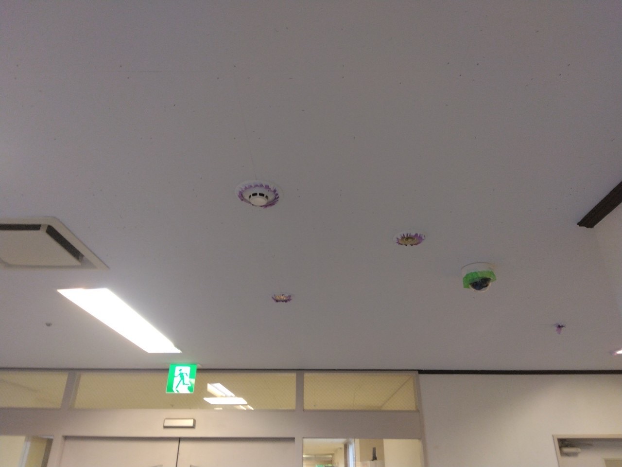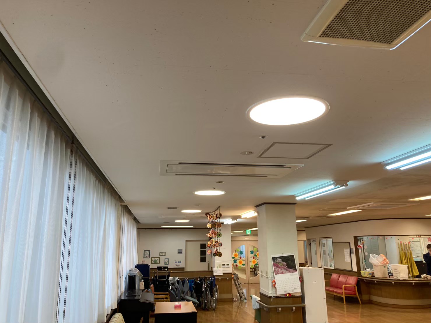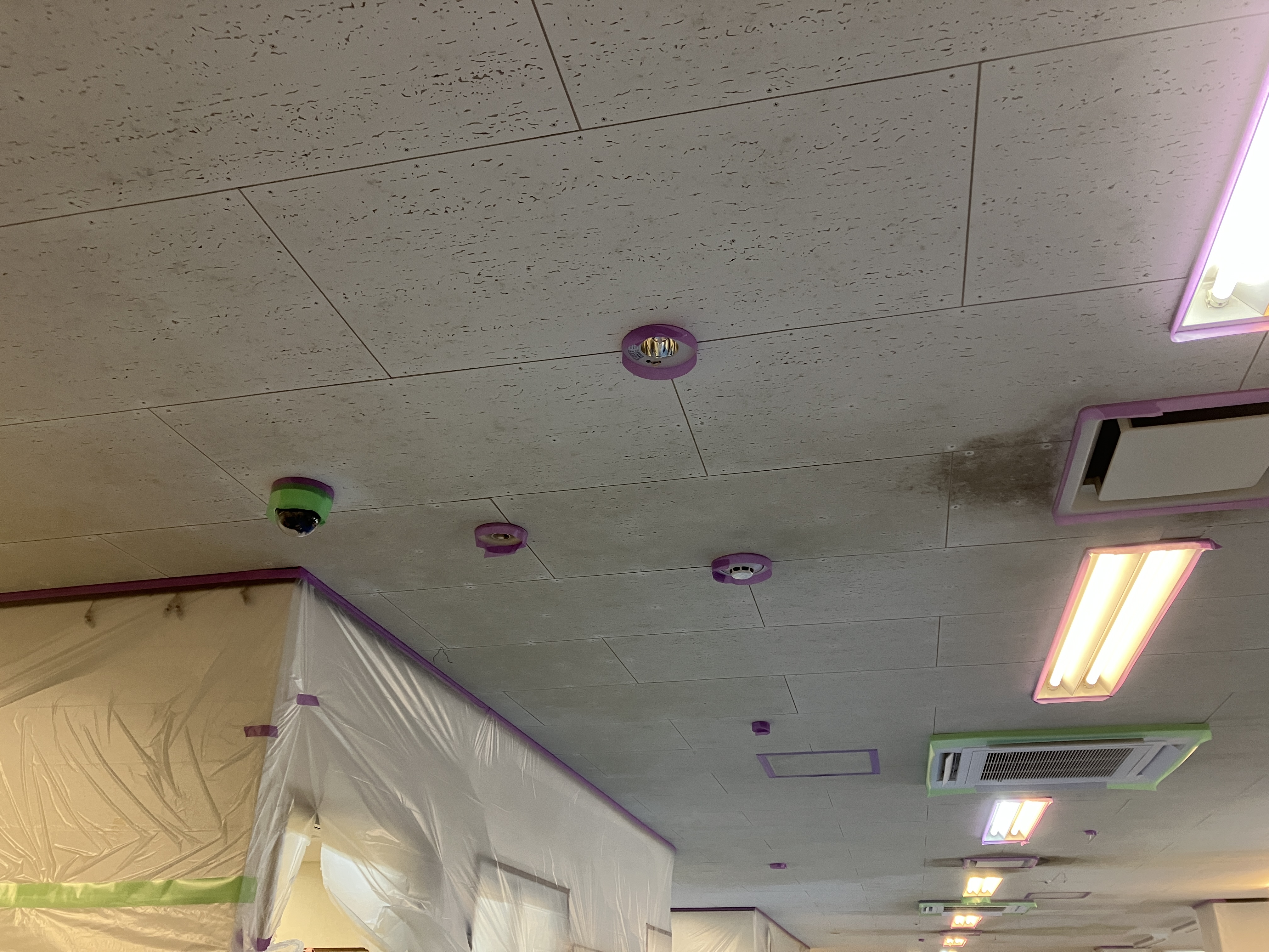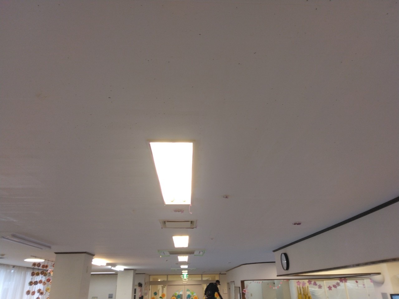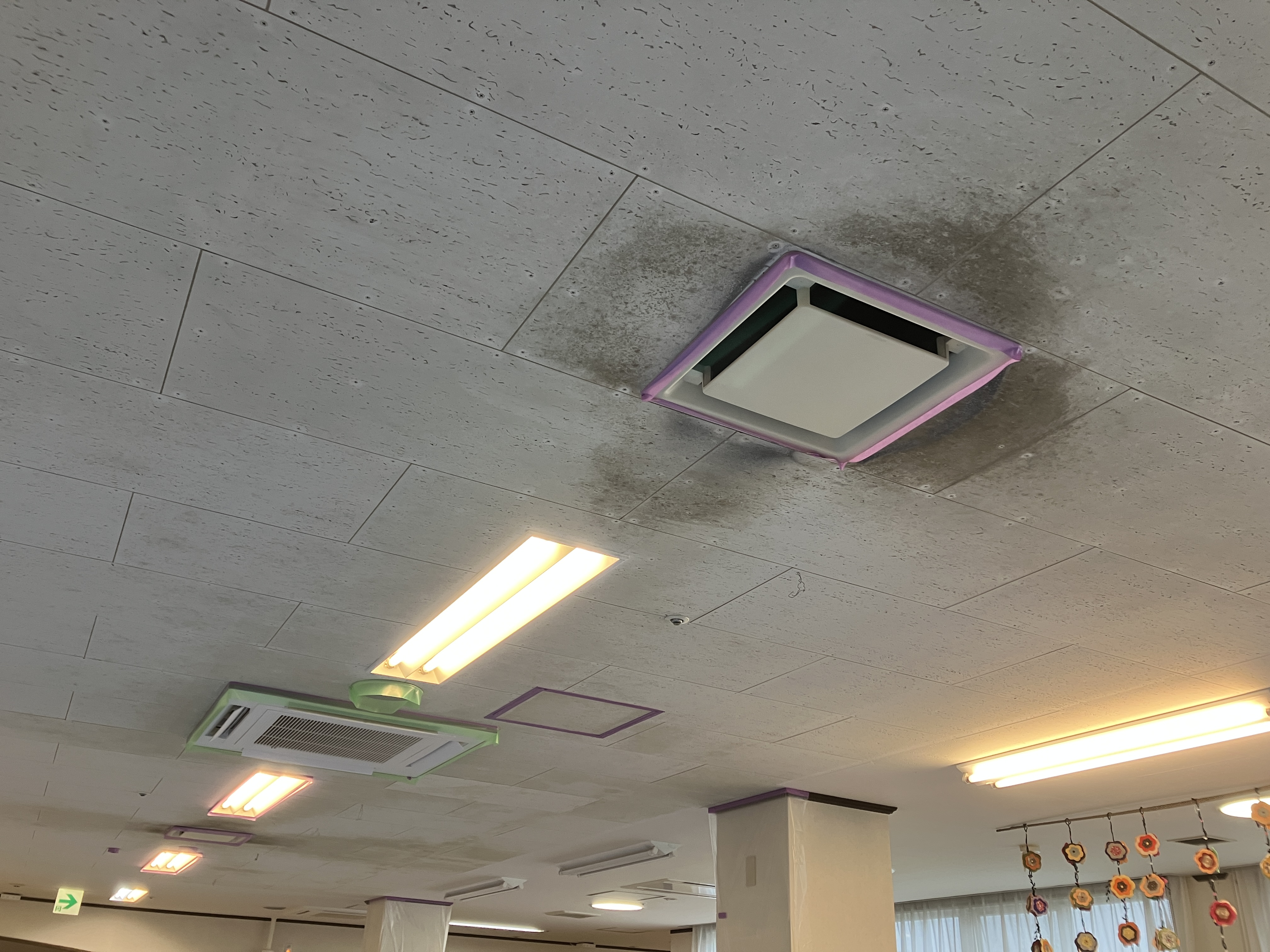 こちらは福祉施設です。天井に黒ずみが見られるとのことで天井のリフォームを承りました。このような室内のリフォームは雨でも着々と進められています。