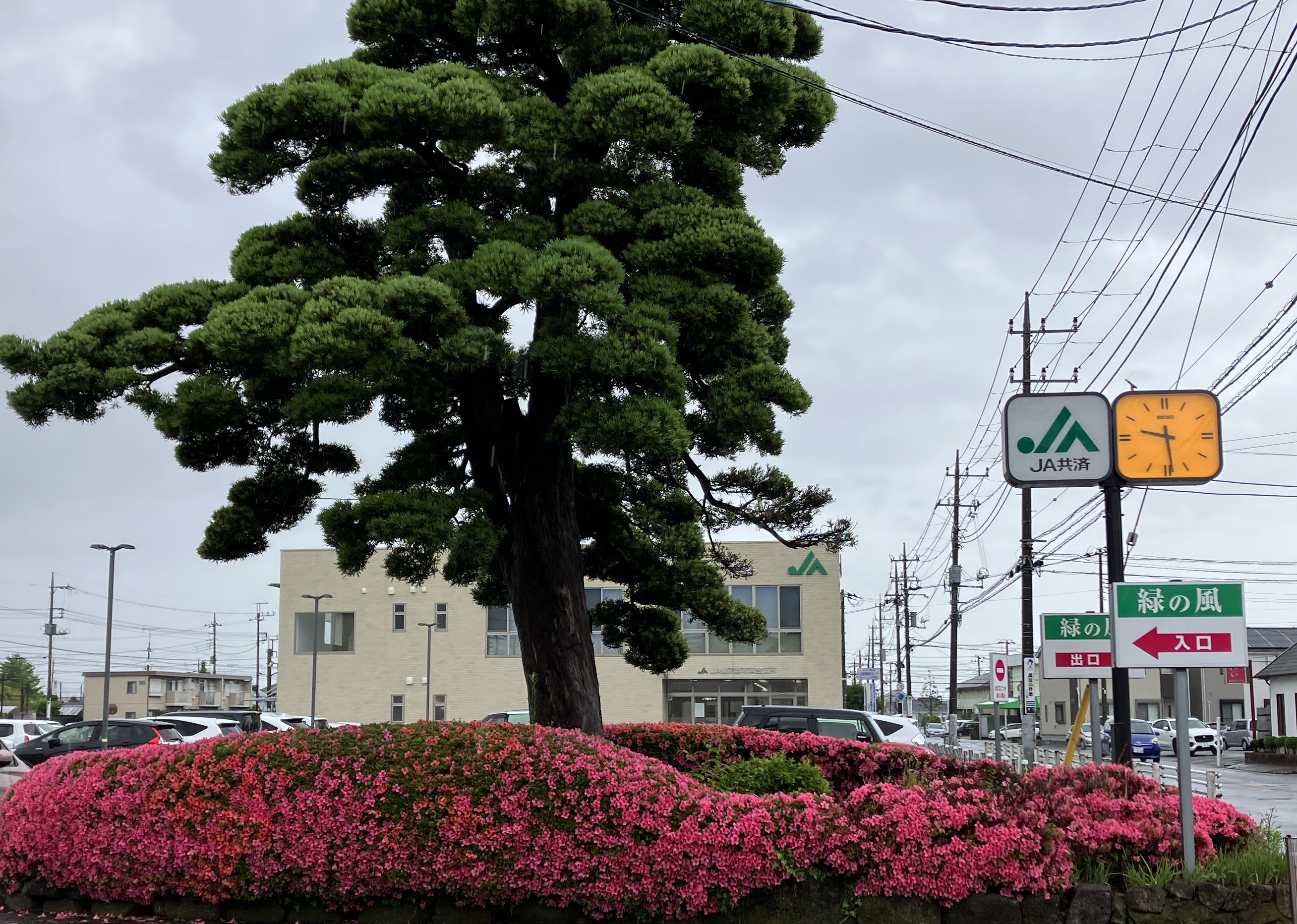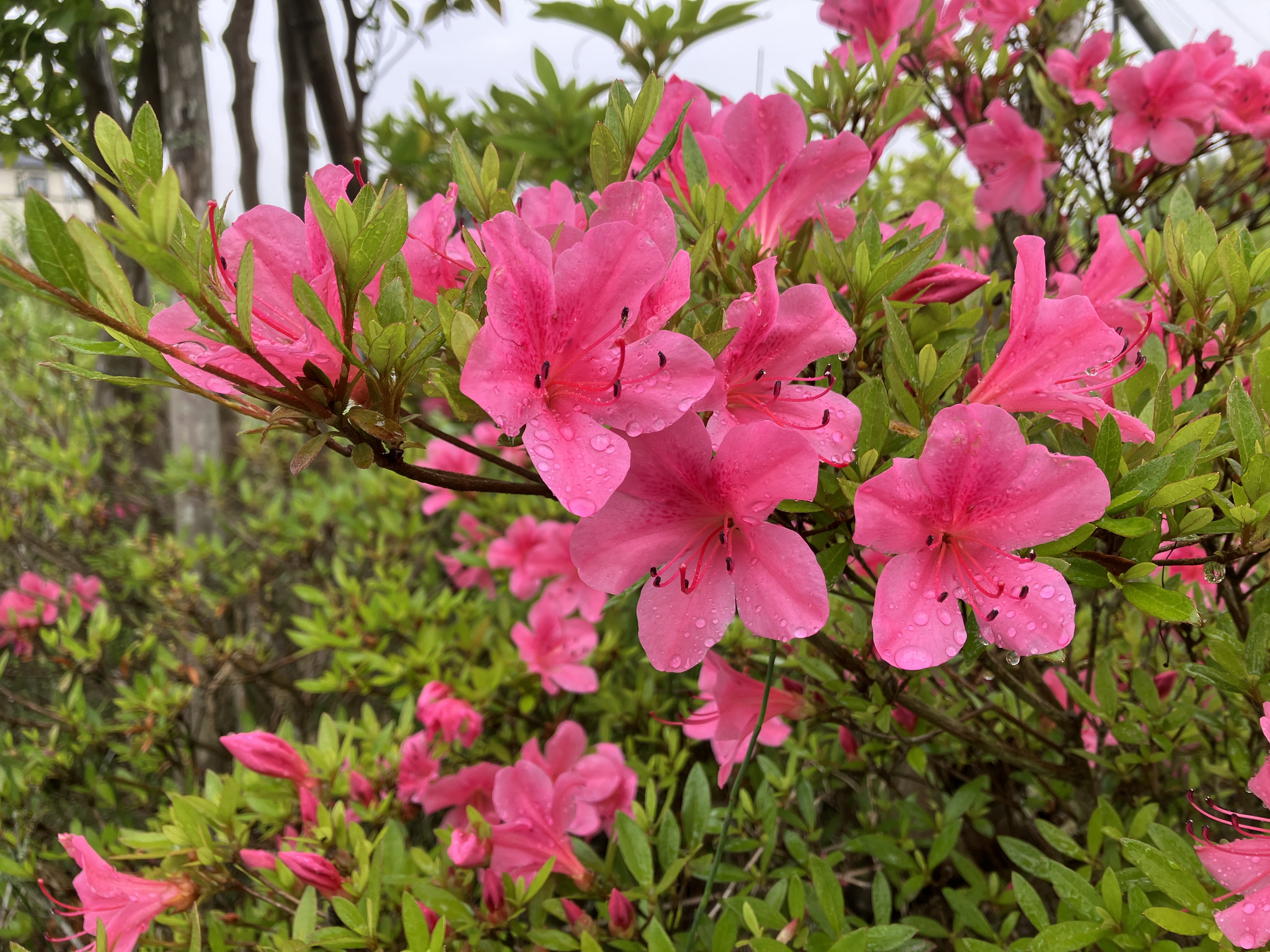 雨の中 キリシマツツジが花を咲かせています。この時期、東金市内でも現場まわりの道中でもよく目にします。ぎっしりと寄せ合うように満開に花をつけている生け垣は、緑深まっていく今の季節の風景の中に鮮やかに映えています。