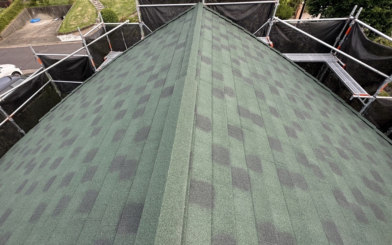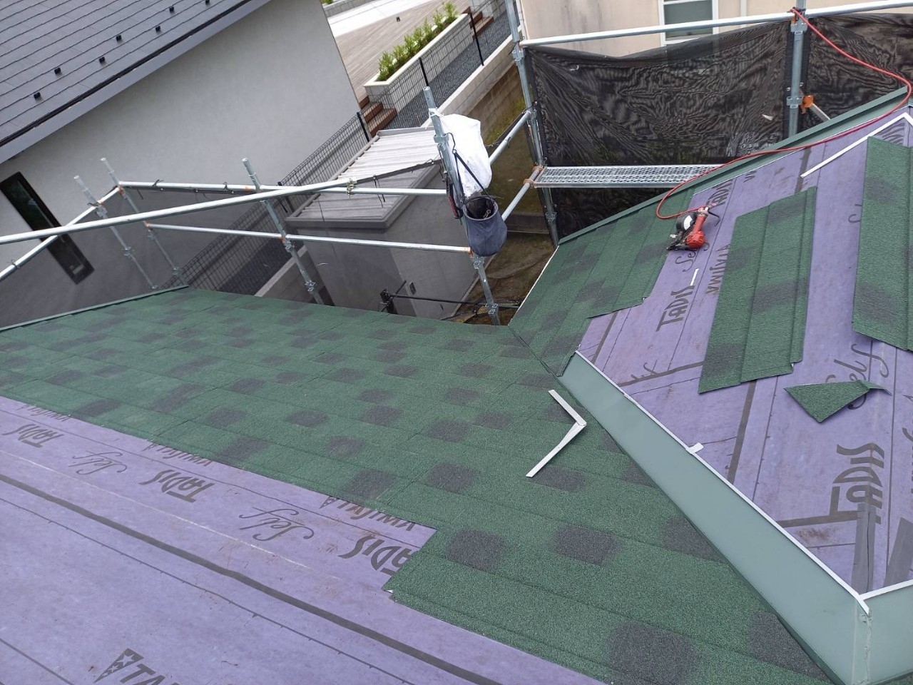 下の方から棟に向かって施工していきます。屋根の谷となっている部分も手抜かりなく作業を進めていきます。2方向から雨水が流れ込む場所なので重要なポイントです。