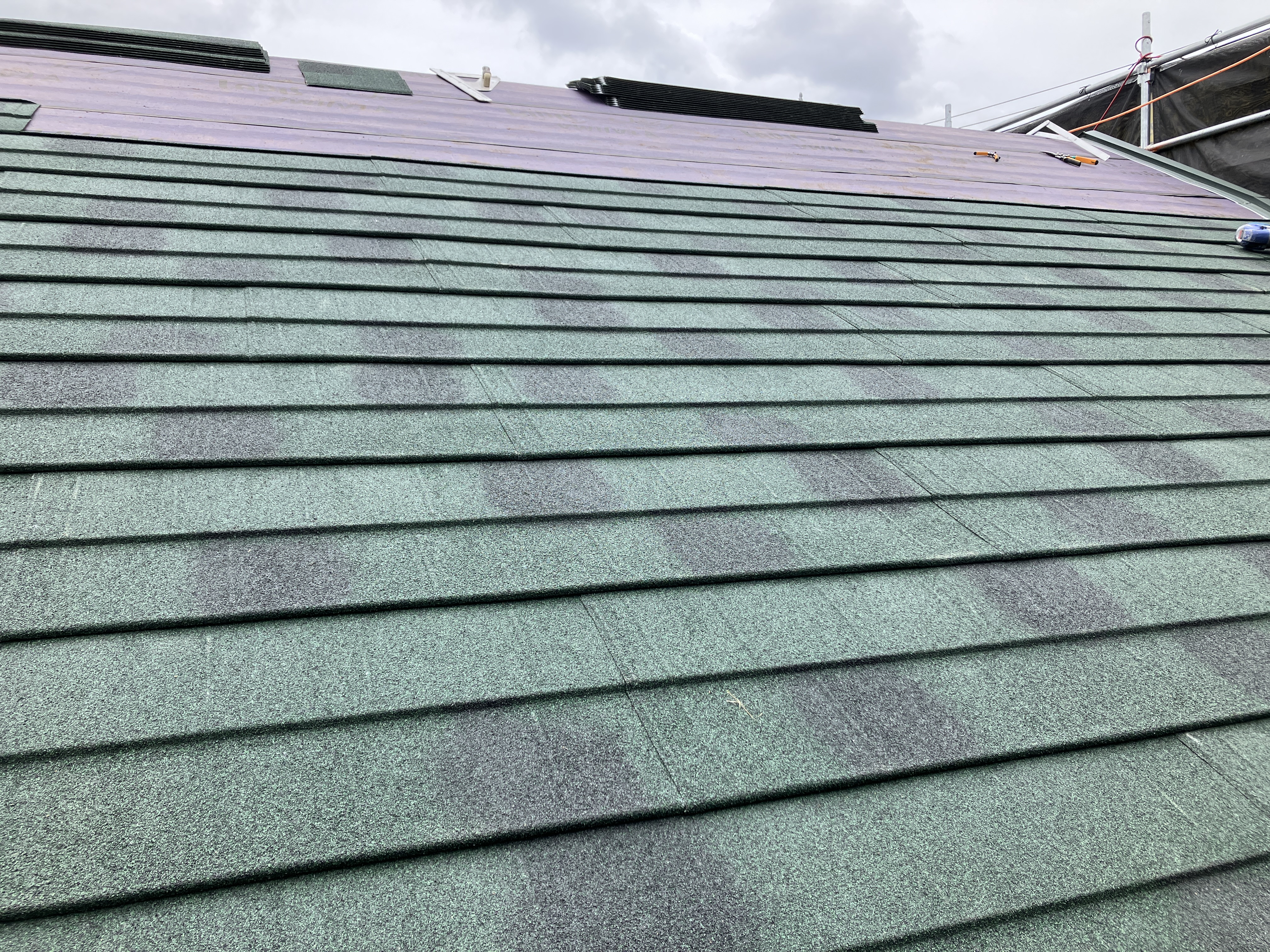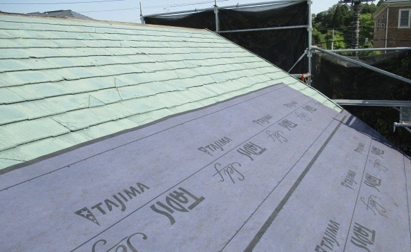 既存の屋根の上から防水シートを屋根全体に貼っていきます。しっかりと雨漏り対策をしていきます。