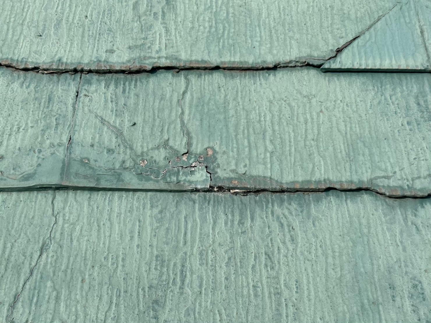 スレートの屋根材にひび割れや欠けが見られました。経年劣化なので塗膜も剥がれ素材自体も傷みが見られました。