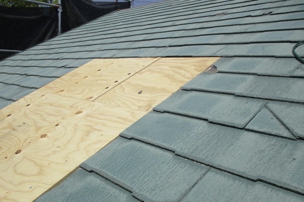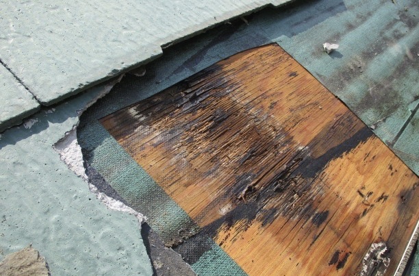 屋根材の下に防水シートがありその下に野地板という板があります。こちらは一般的な屋根の構造です。屋根裏から確認した状態と同じように木材の腐食やカビが見られます。腐食部分は撤去して、新しい板と交換します。
