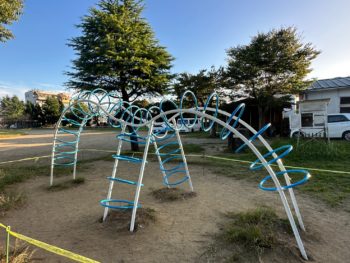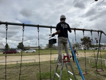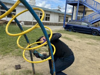 大人気のこちらの遊具、曲線が多いので下地処理は2人がかりで行います!