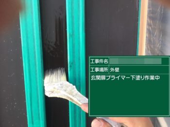 玄関ドア下塗り施工中